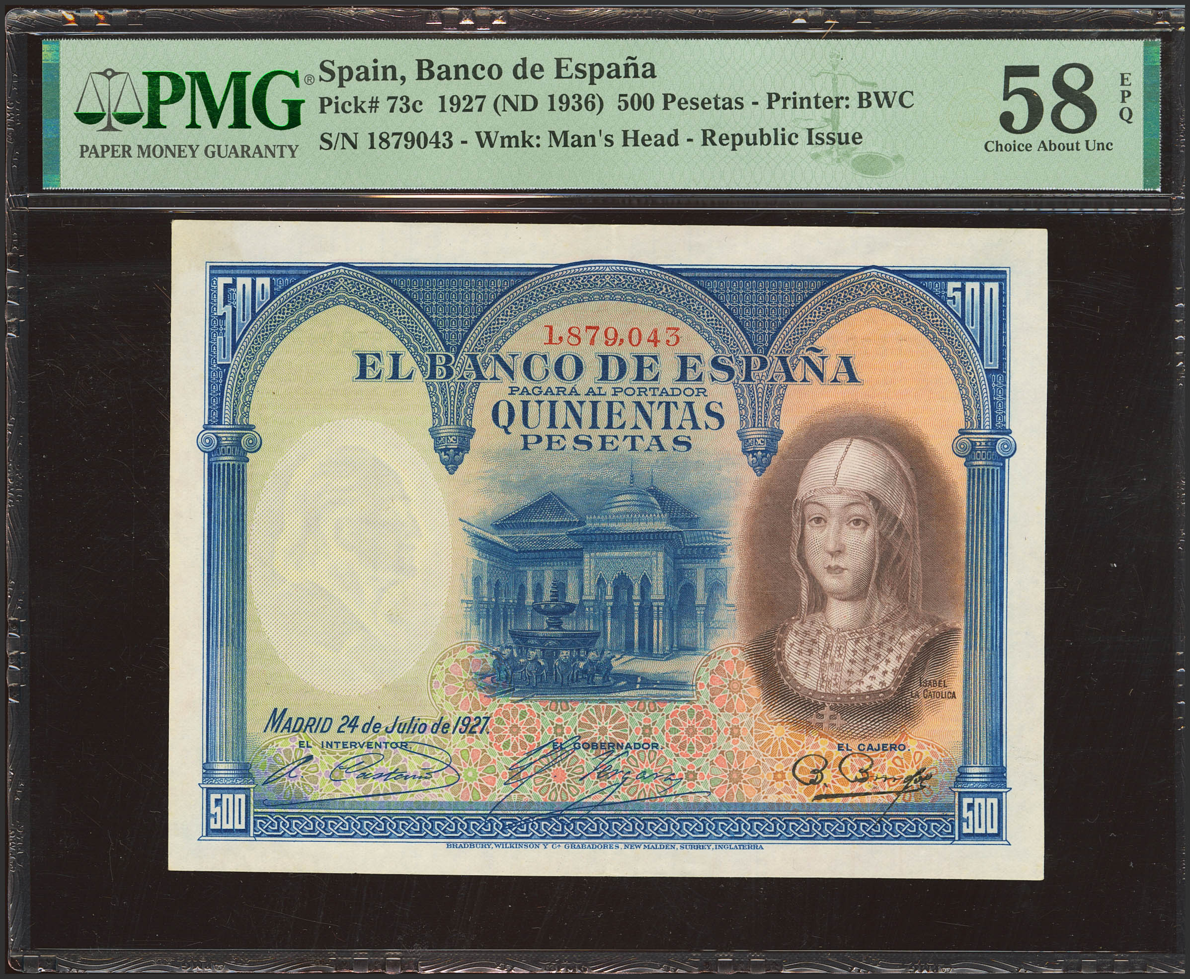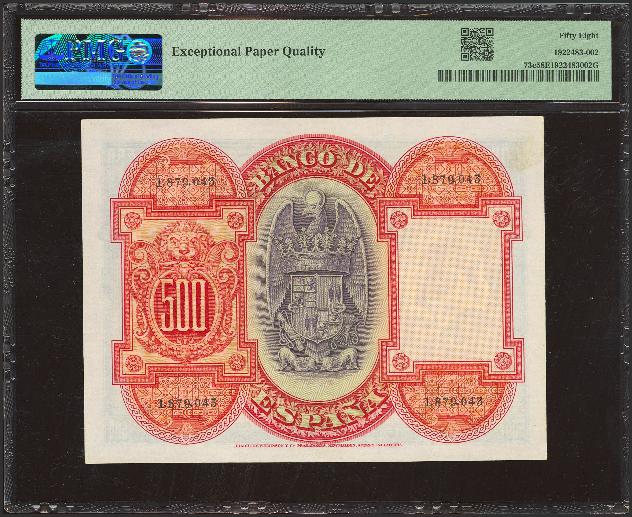 500 Pesetas. 24 de Julio de 1927. Sin serie y numeración posterior 1602000. (Edifil 2023: 352, Pick: 73c). Inusual en esta calidad, apresto original. EBC+++. Encapsulado PMG58EPQ.