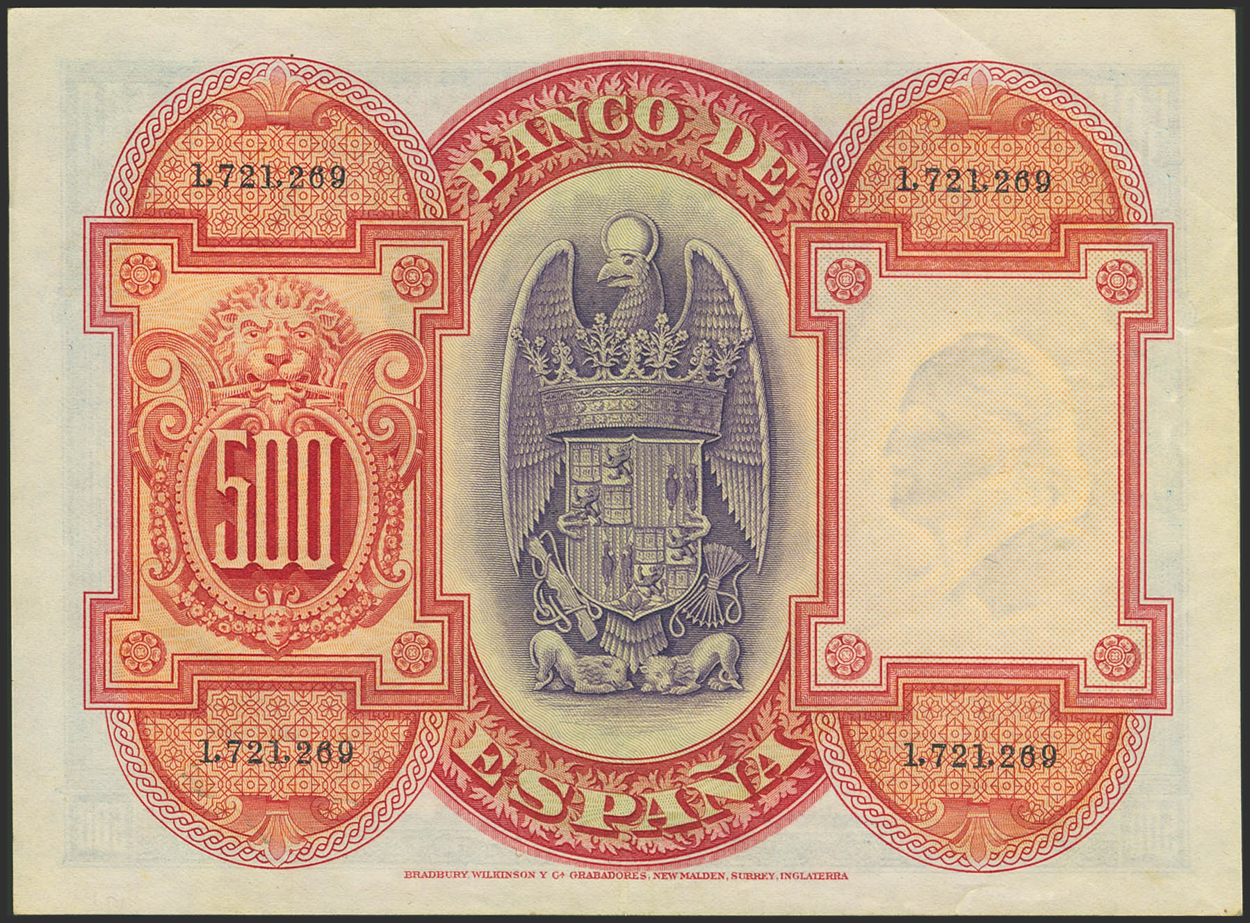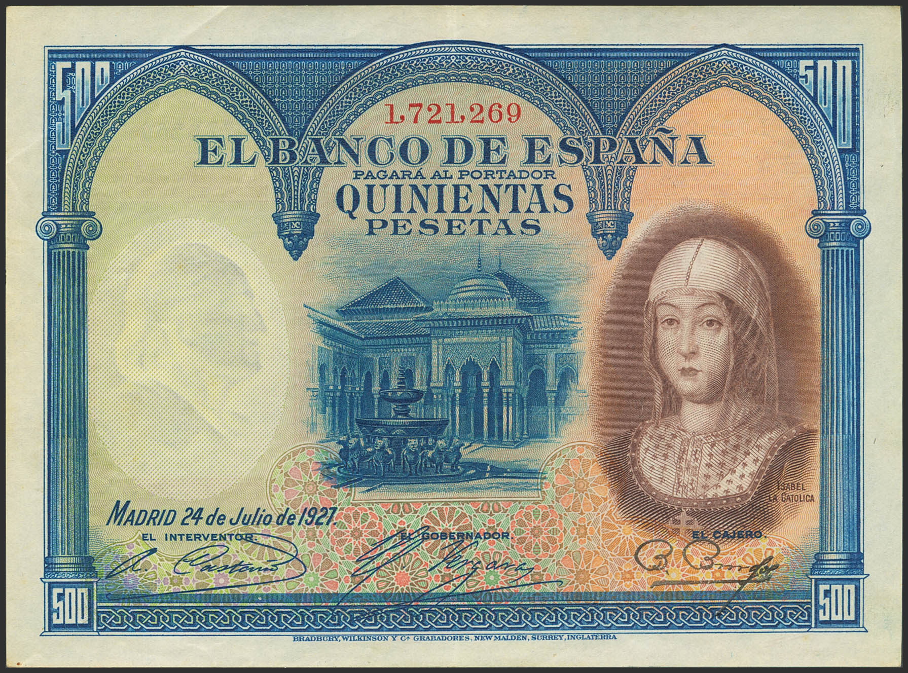500 Pesetas. 24 de Julio de 1927. Sin serie. (Edifil 2023: 352). Conserva parte del apresto original. EBC-.