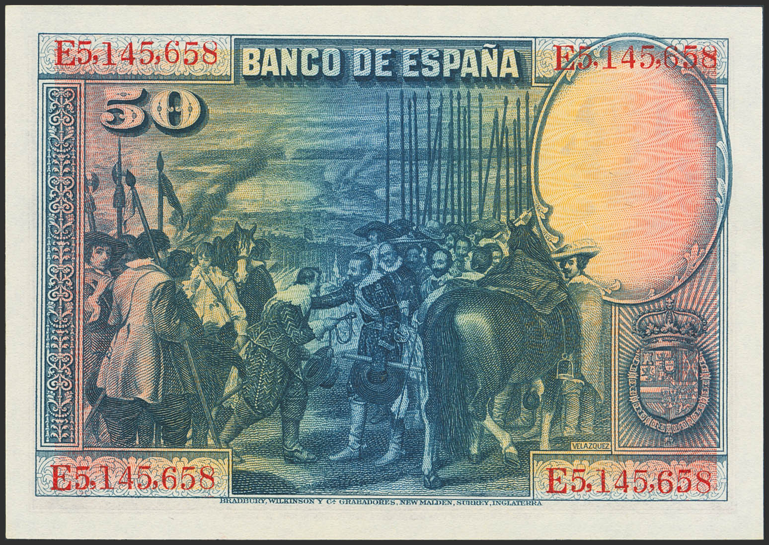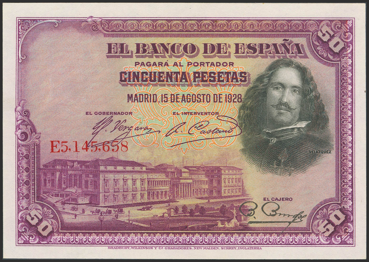 50 Pesetas. 15 de Agosto de 1928. Serie E. (Edifil 2023: 354). Conserva todo su apresto original. SC-.