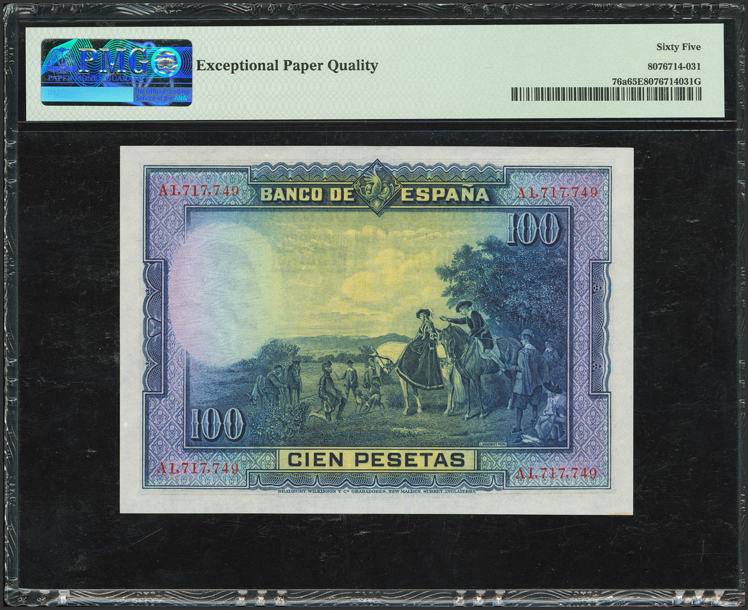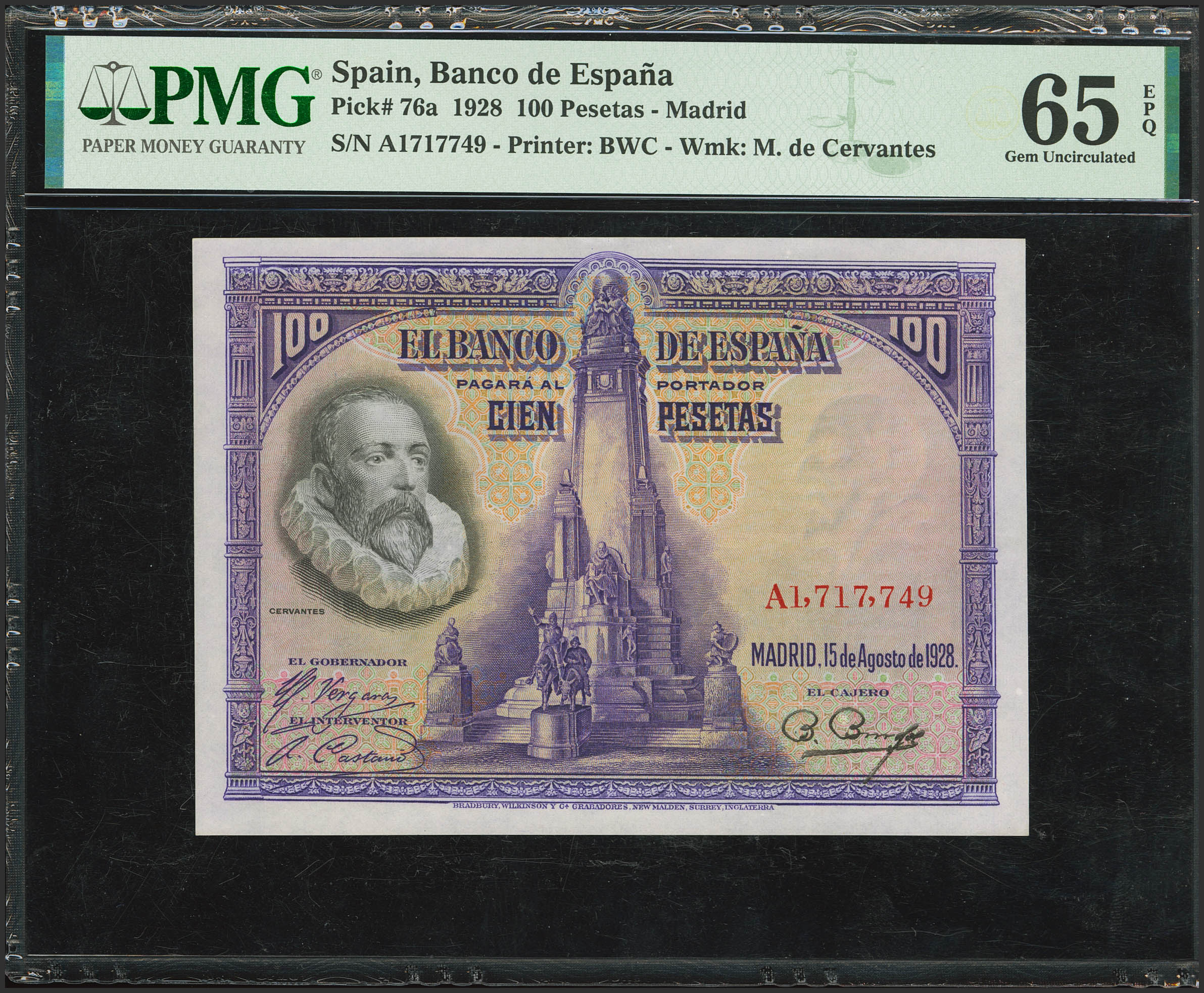 100 Pesetas. 15 de Agosto de 1928. Serie A. (Edifil 2023: 355a, Pick: 76a). Inusual en esta excepcional calidad, apresto original. SC. Encapsulado PMG65EPQ.