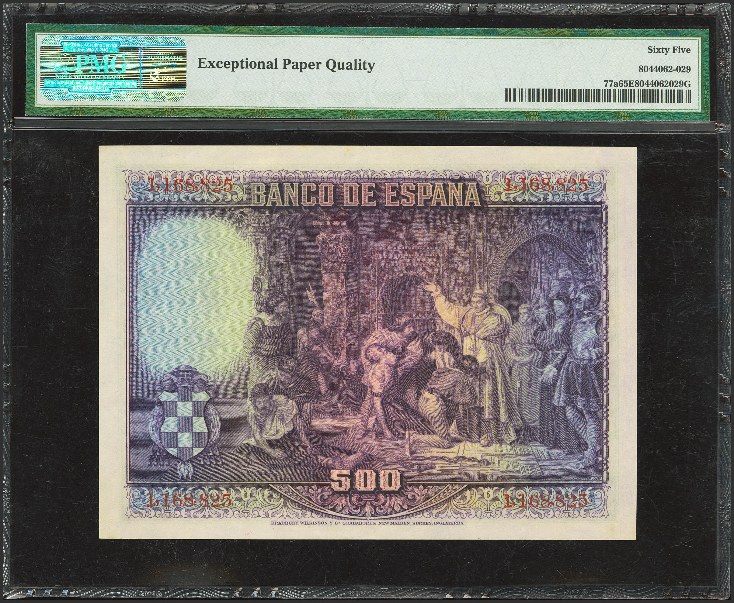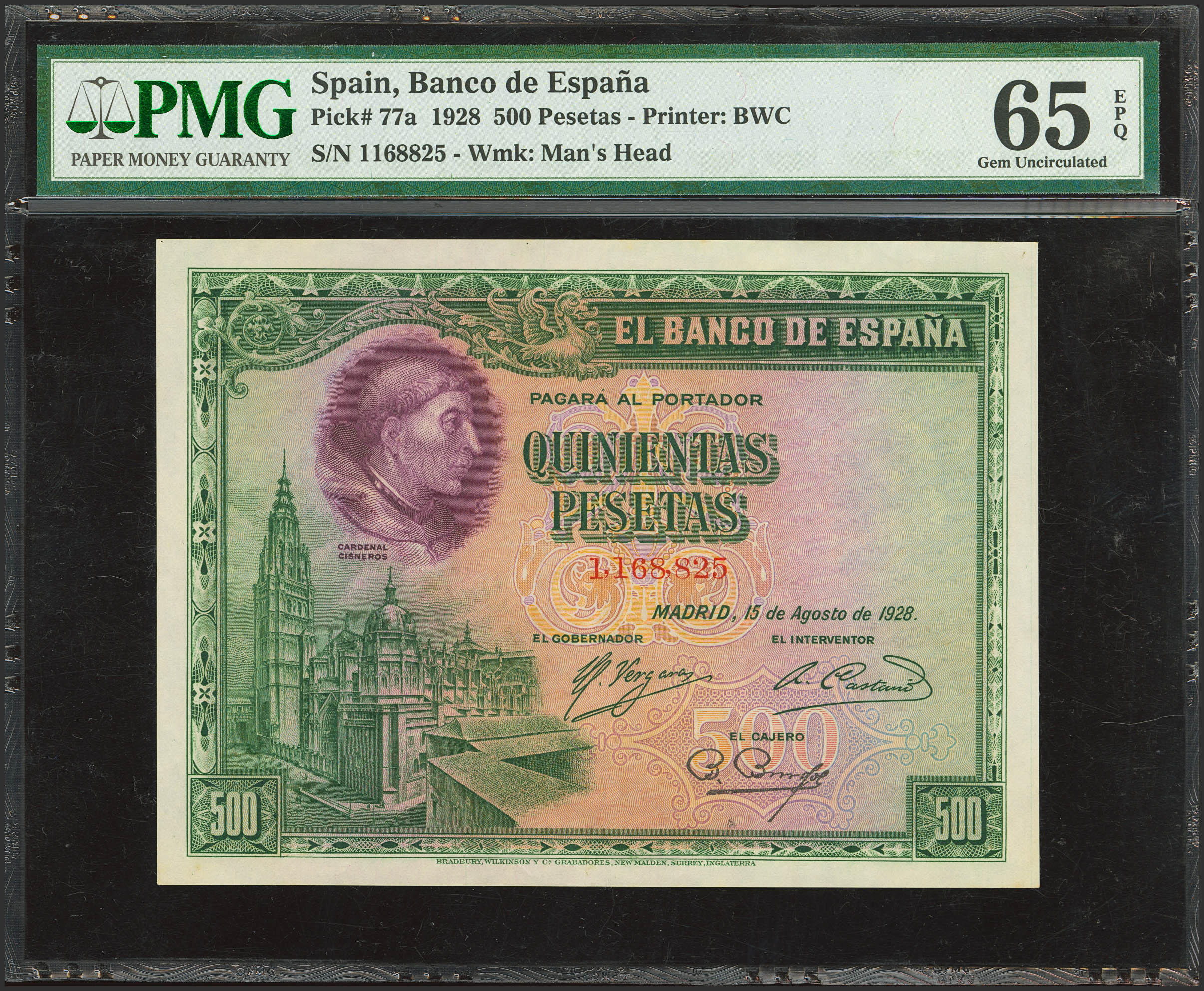 500 Pesetas. 15 de Agosto de 1928. Sin serie. (Edifil 2023: 356, Pick: 77a). Apresto original. SC. Encapsulado PMG65EPQ.
