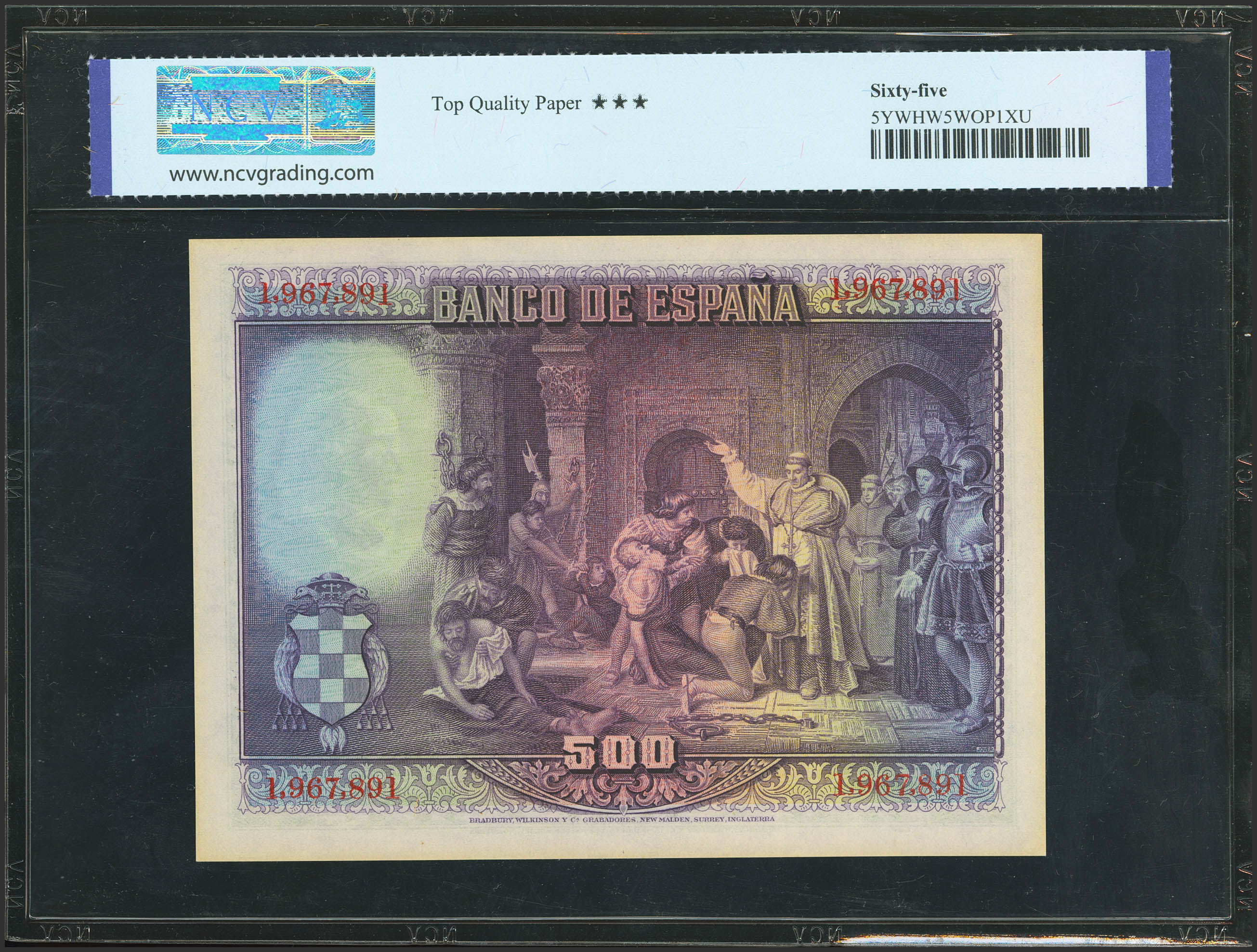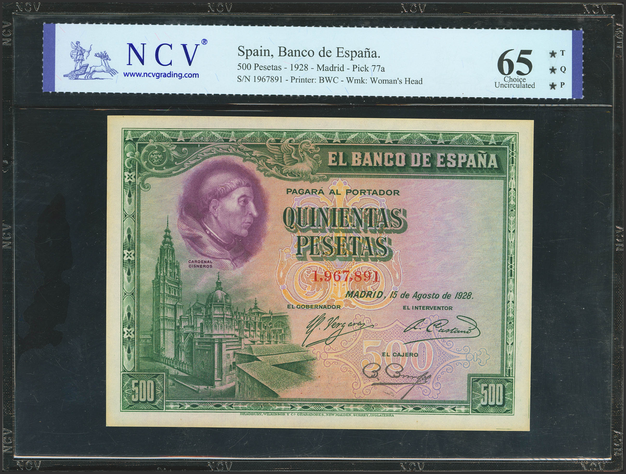 500 Pesetas. 15 de Agosto de 1928. Sin serie. (Edifil 2023: 356, Pick: 77a). Apresto original, tonalizado. SC. Encapsulado NCV65TQP.