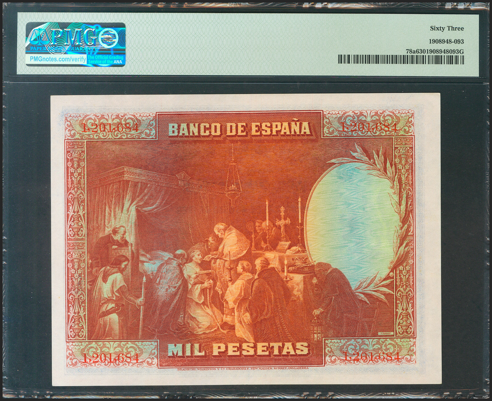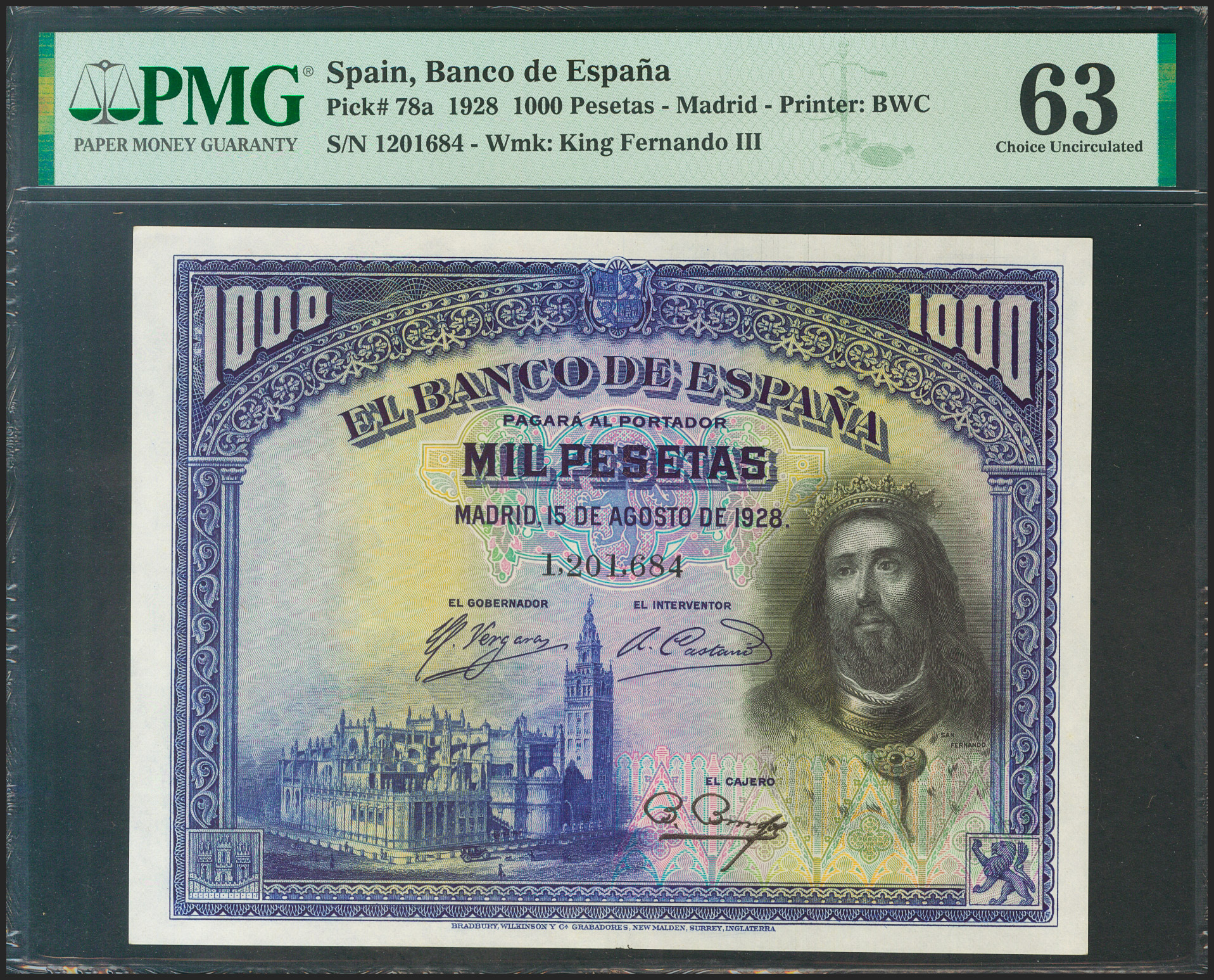 1000 Pesetas. 15 de Agosto de 1928. Sin serie. (Edifil 2021: 357, Pick: 78a). SC. Encapsulado PMG63.