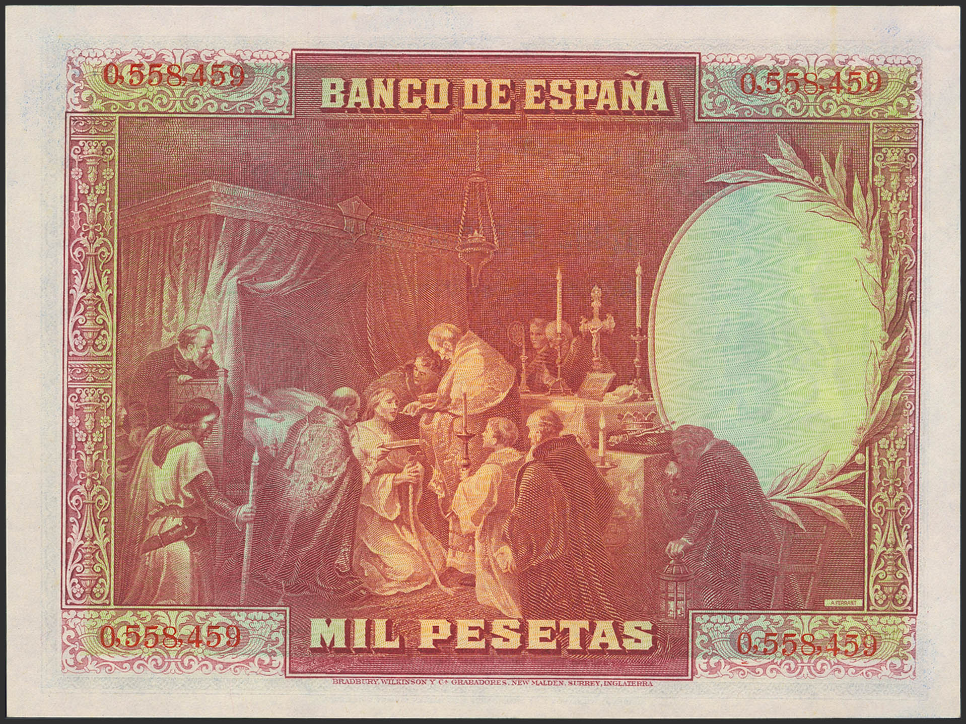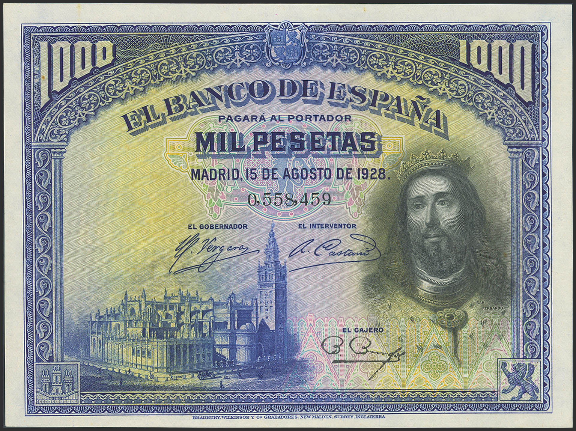 1000 Pesetas. 15 de Agosto de 1928. Sin serie. (Edifil 2023: 357). Inusual, manchitas del tiempo. SC-.
