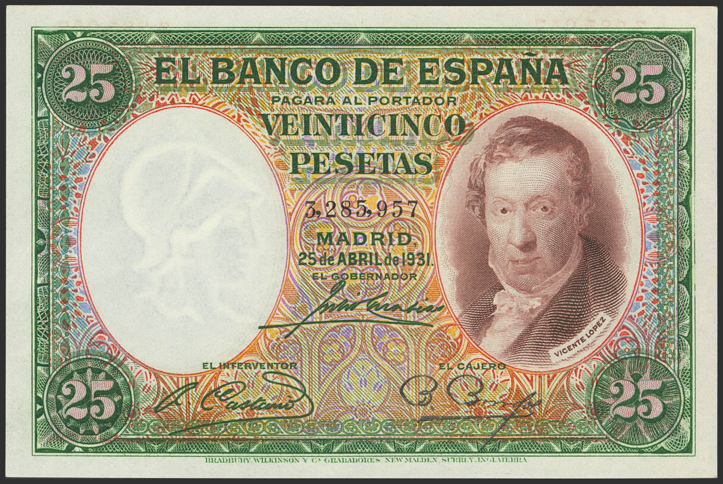 25 Pesetas. 25 de Abril de 1931. Sin serie. (Edifil 2023: 358). Conserva todo su apresto original. SC.