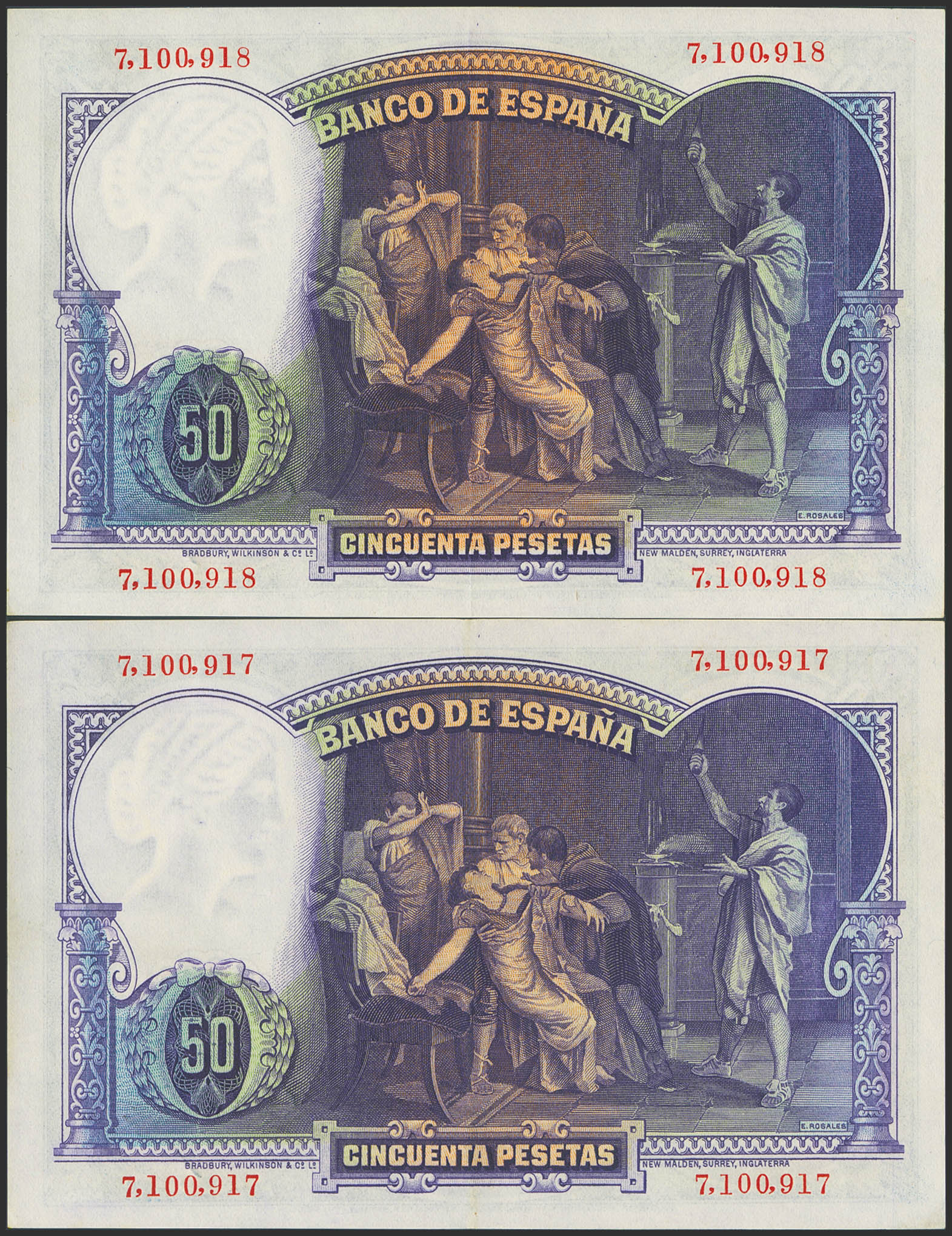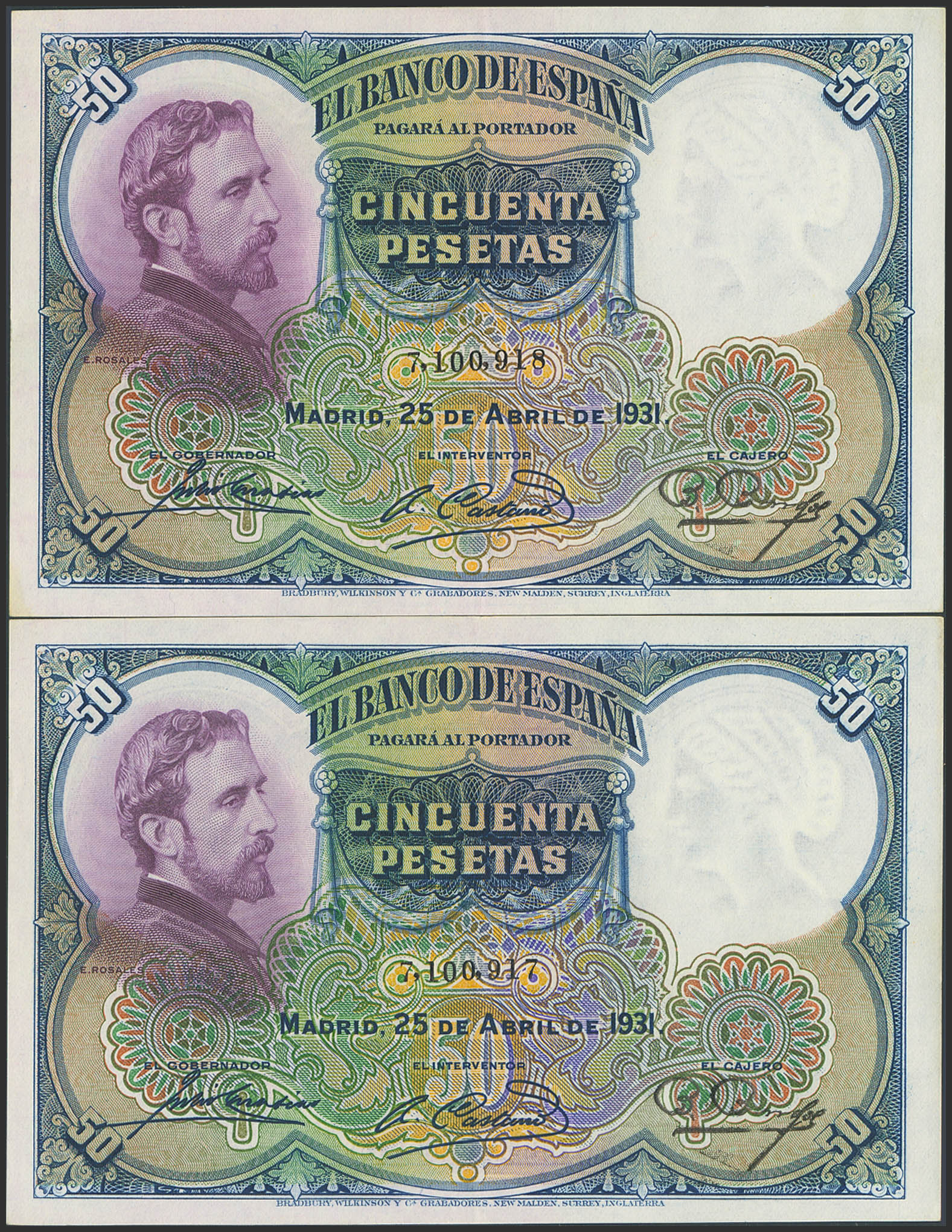 50 Pesetas. 25 de Abril de 1931. Pareja correlativa. Sin serie. (Edifil 2023: 359). Inusual, conserva parte de su apresto original, sombritas del tiempo. EBC.