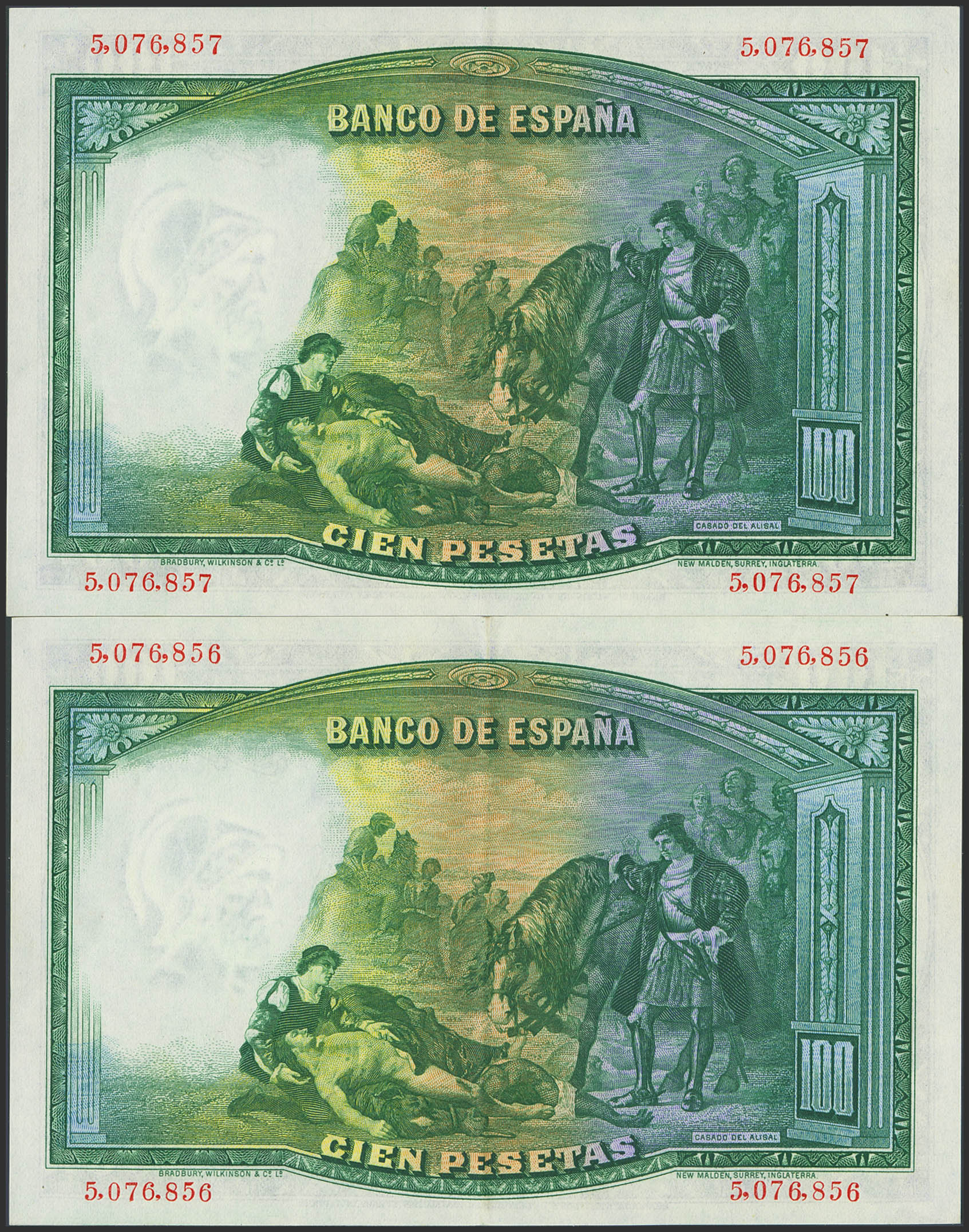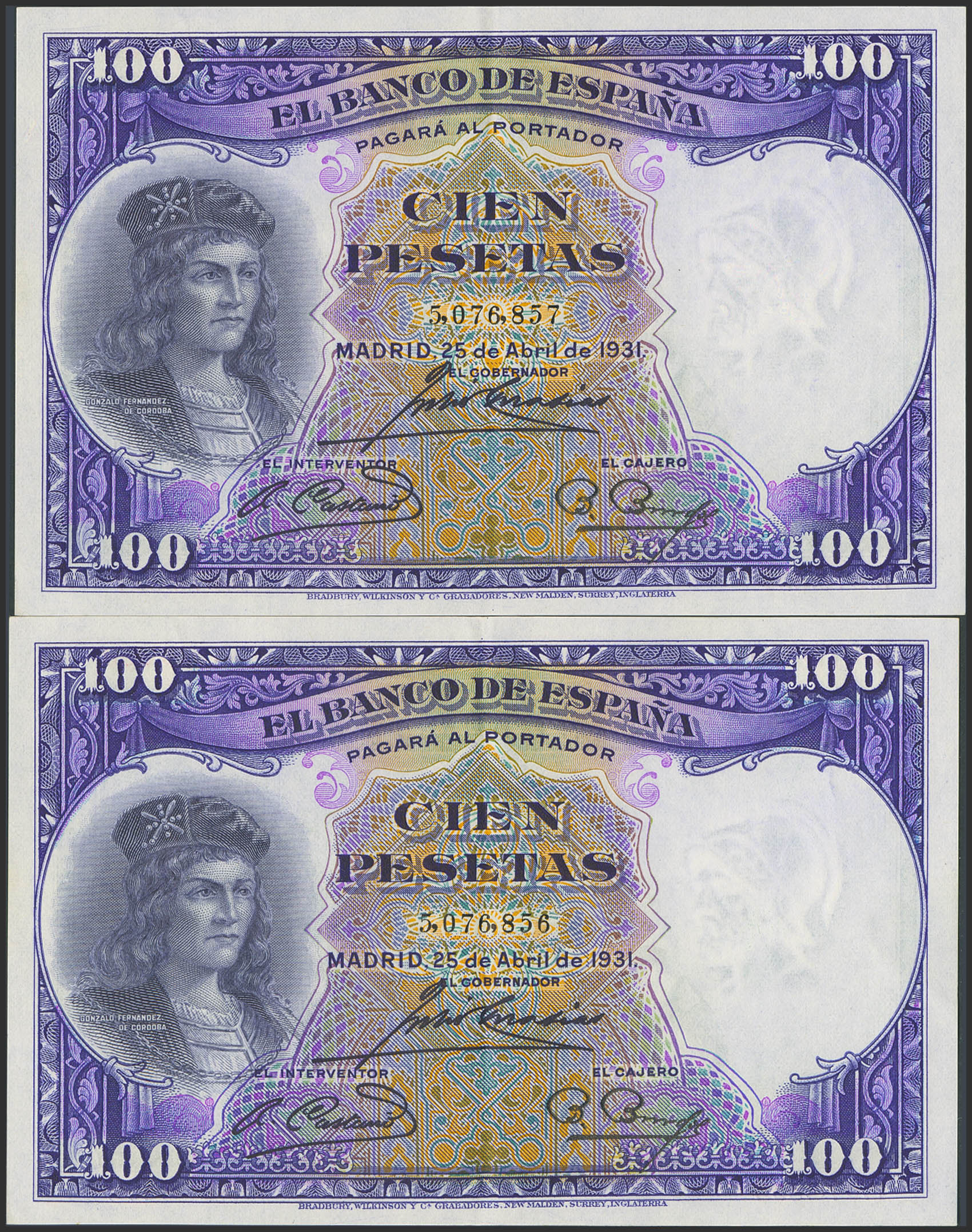 100 Pesetas. 25 de Abril de 1931. Pareja correlativa. Sin serie. (Edifil 2023: 360). Conserva gran parte de su apresto original. EBC+.
