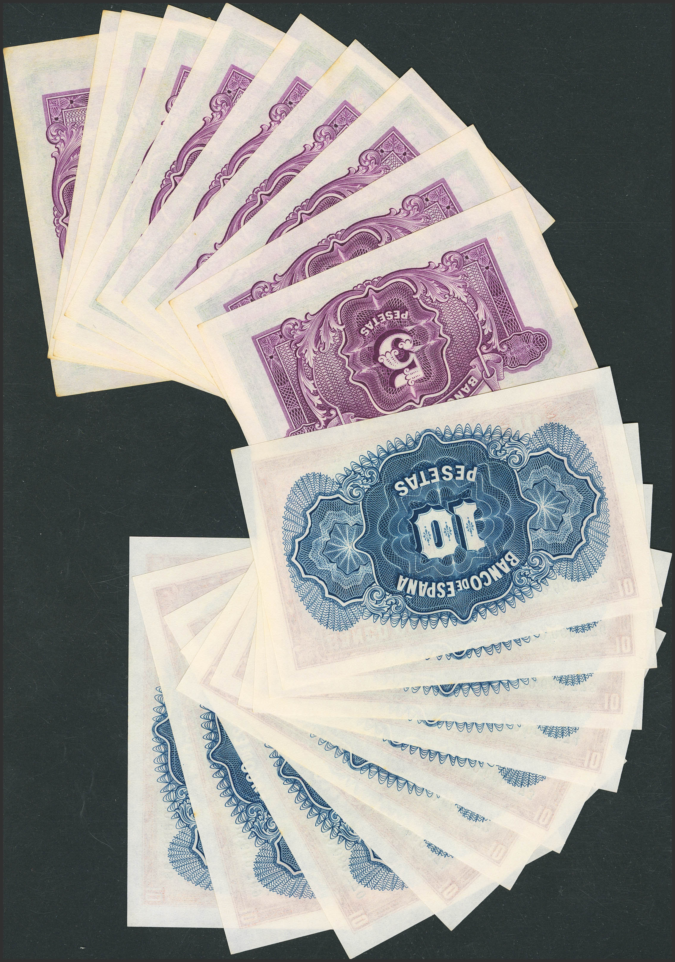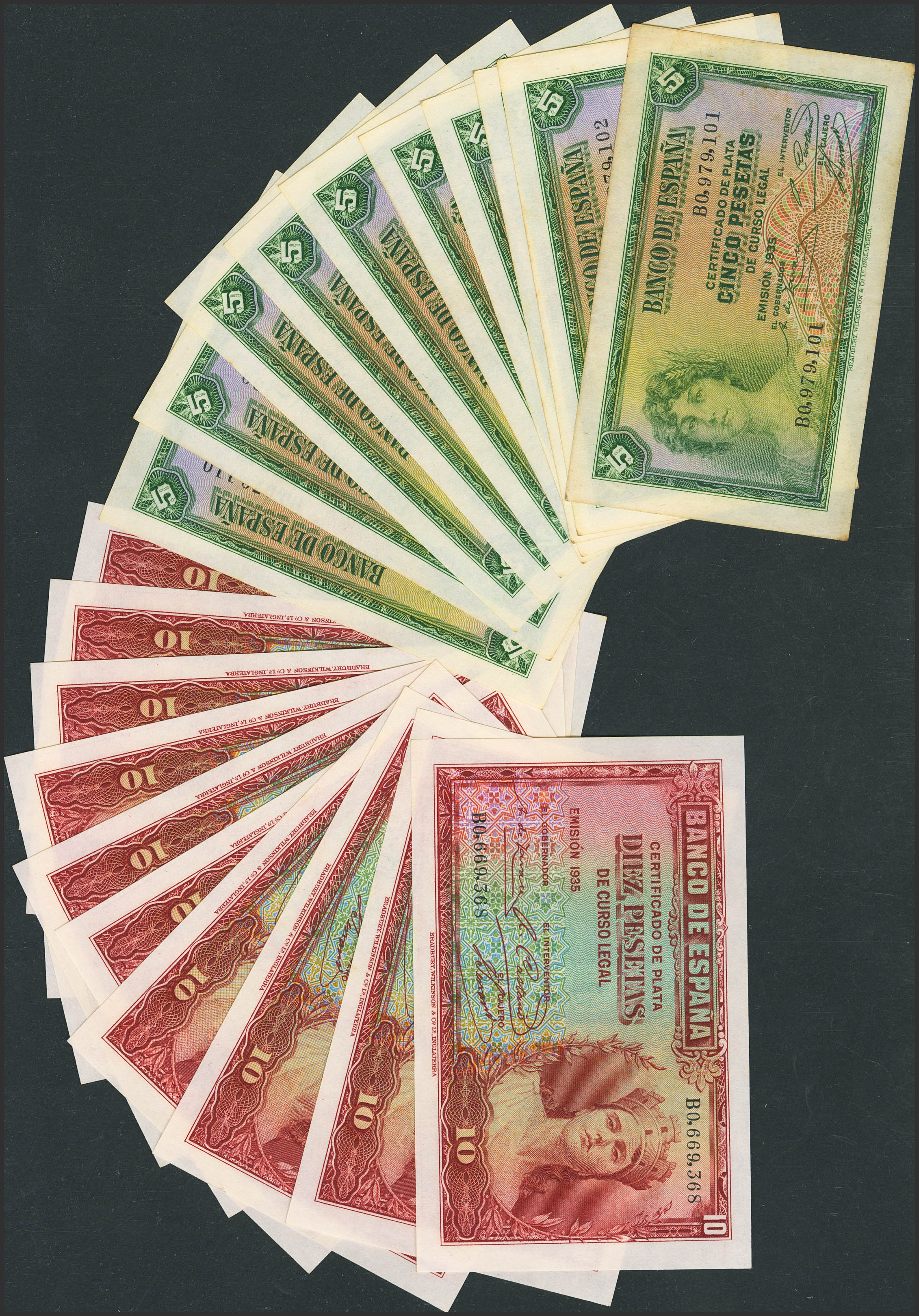 Conjunto de 10 billetes correlativos de 5 Pesetas y 10 Pesetas Certificado de Plata emitidos en 1935 y ambos con las serie B (Edifil 2023: 2021: 363a, 364a), conservando todo su apresto original. SC/SC--.
