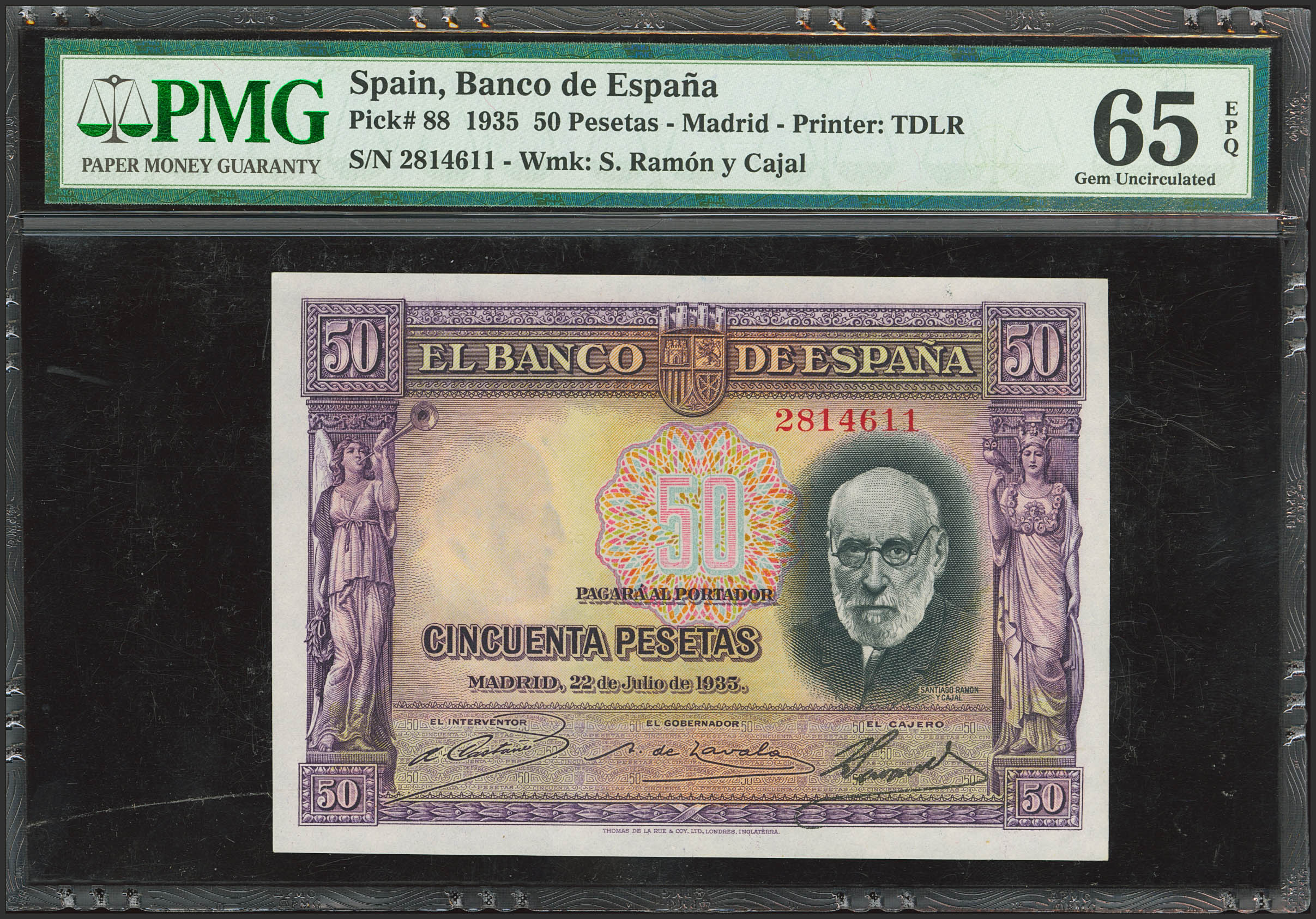 50 Pesetas. 22 de Julio de 1935. Sin serie. (Edifil 2023: 366, Pick: 88a). Apresto original. SC. Encapsulado PMG65EPQ.