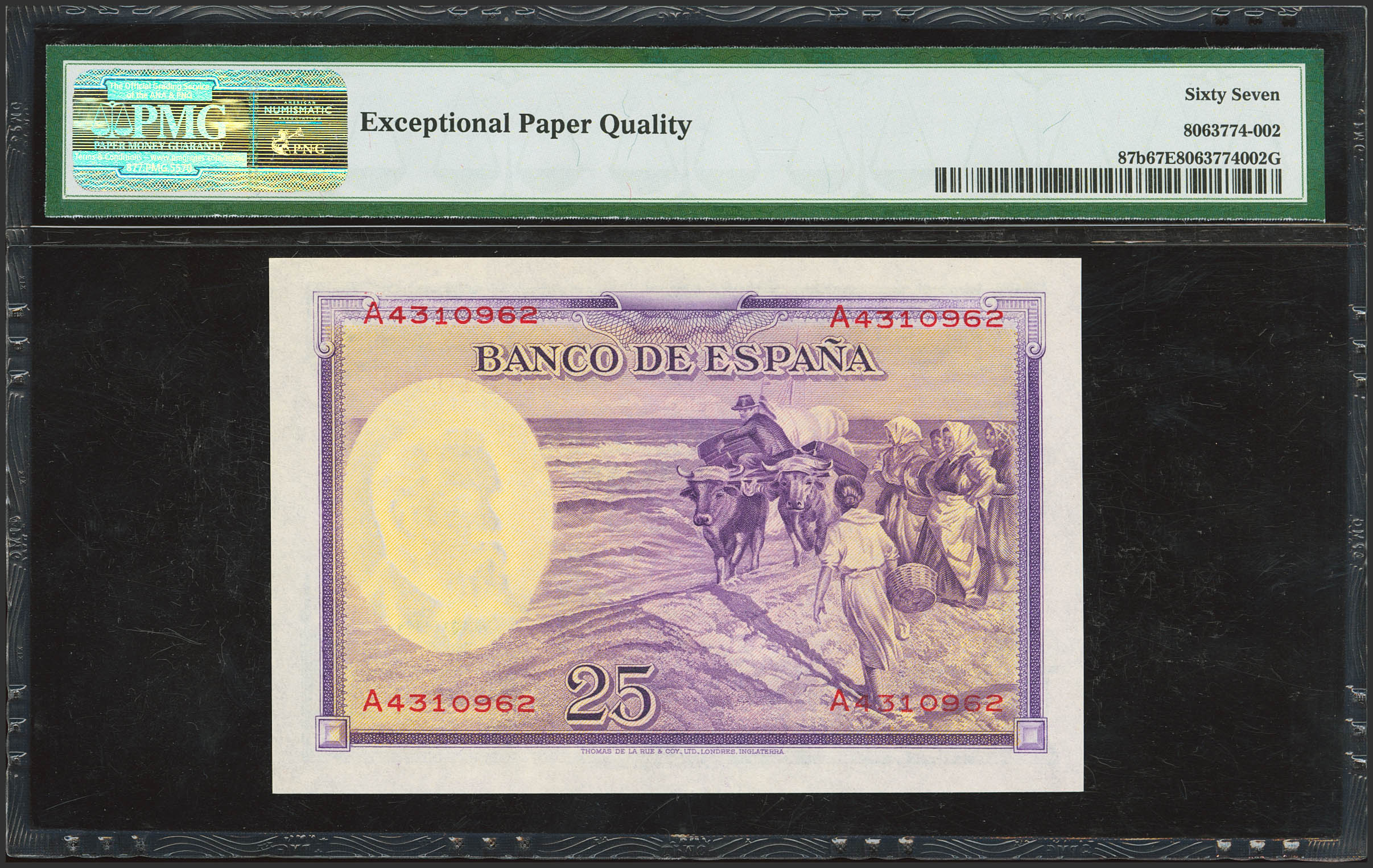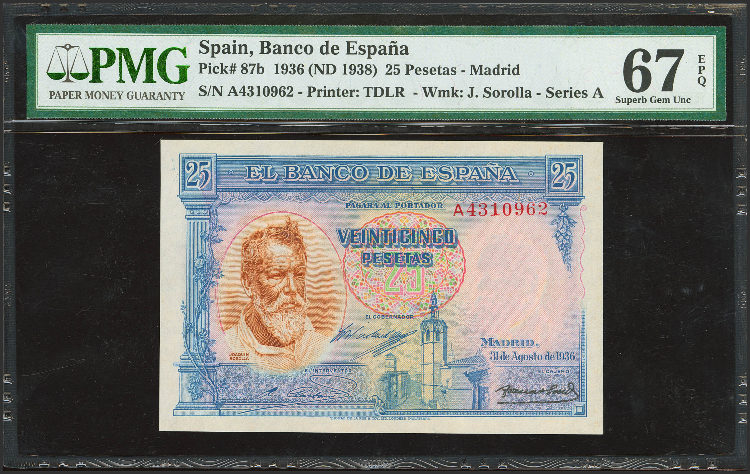 25 Pesetas. 31 de Agosto de 1936. Serie A. (Edifil 2023: 367a, Pick: 87b). Raro en esta excepcional calidad, apresto original. SC. Encapsulado PMG67EPQ.