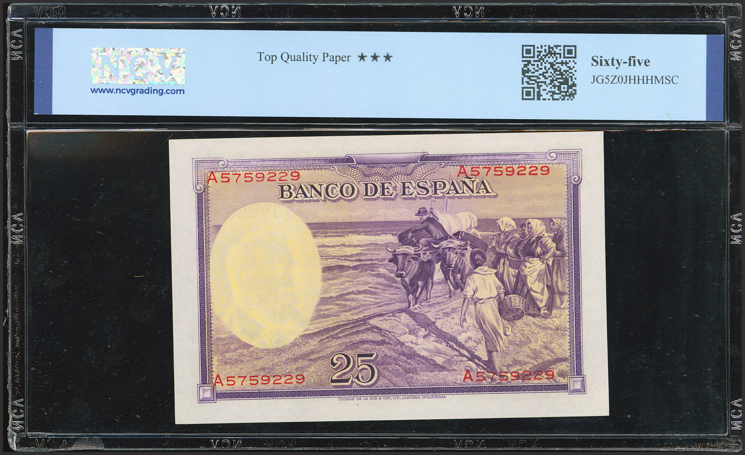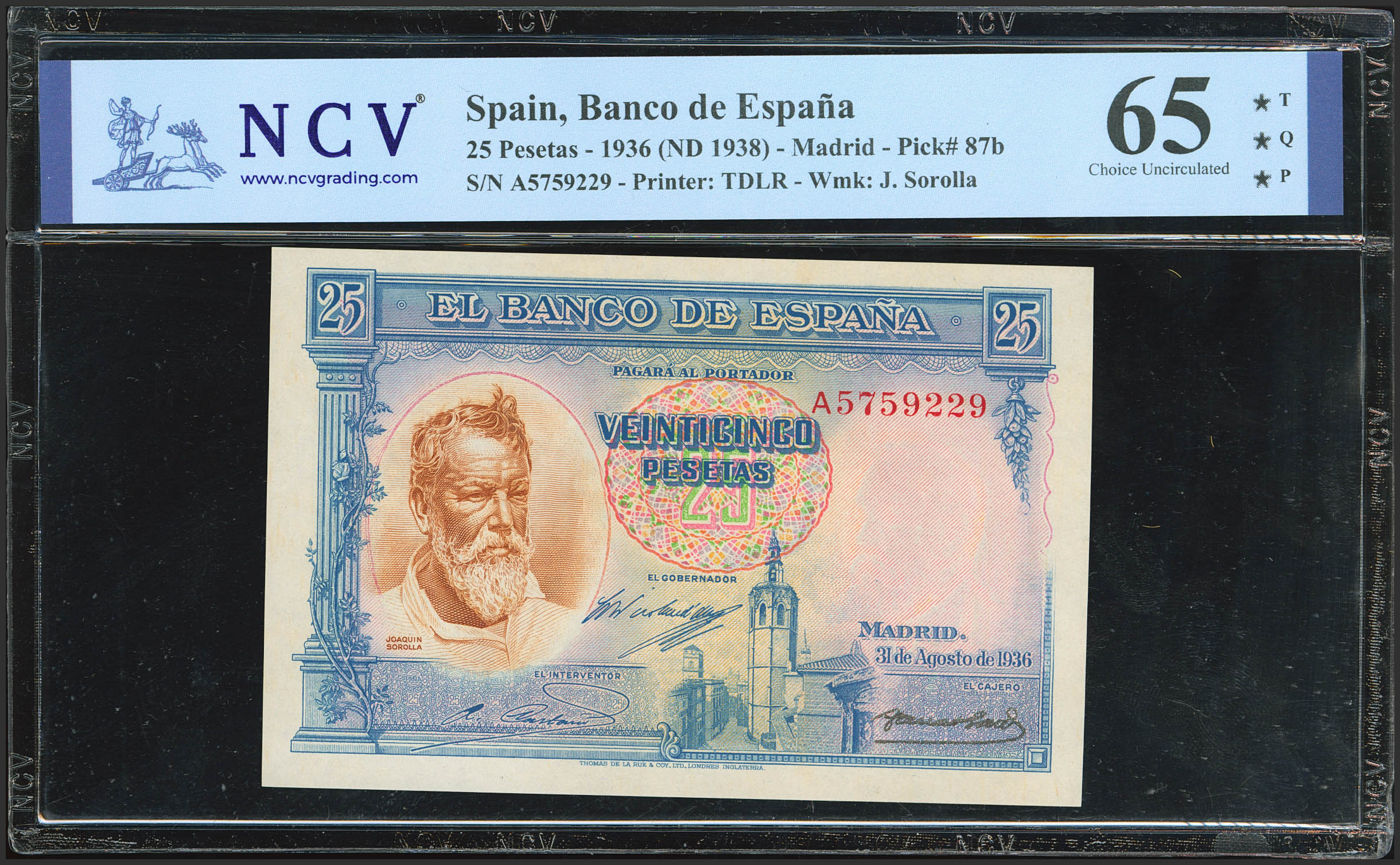 25 Pesetas. 31 de Agosto de 1936. Serie A. (Edifil 2023: 367a, Pick: 87b). Apresto original. Encapsulado NCV65TQP.