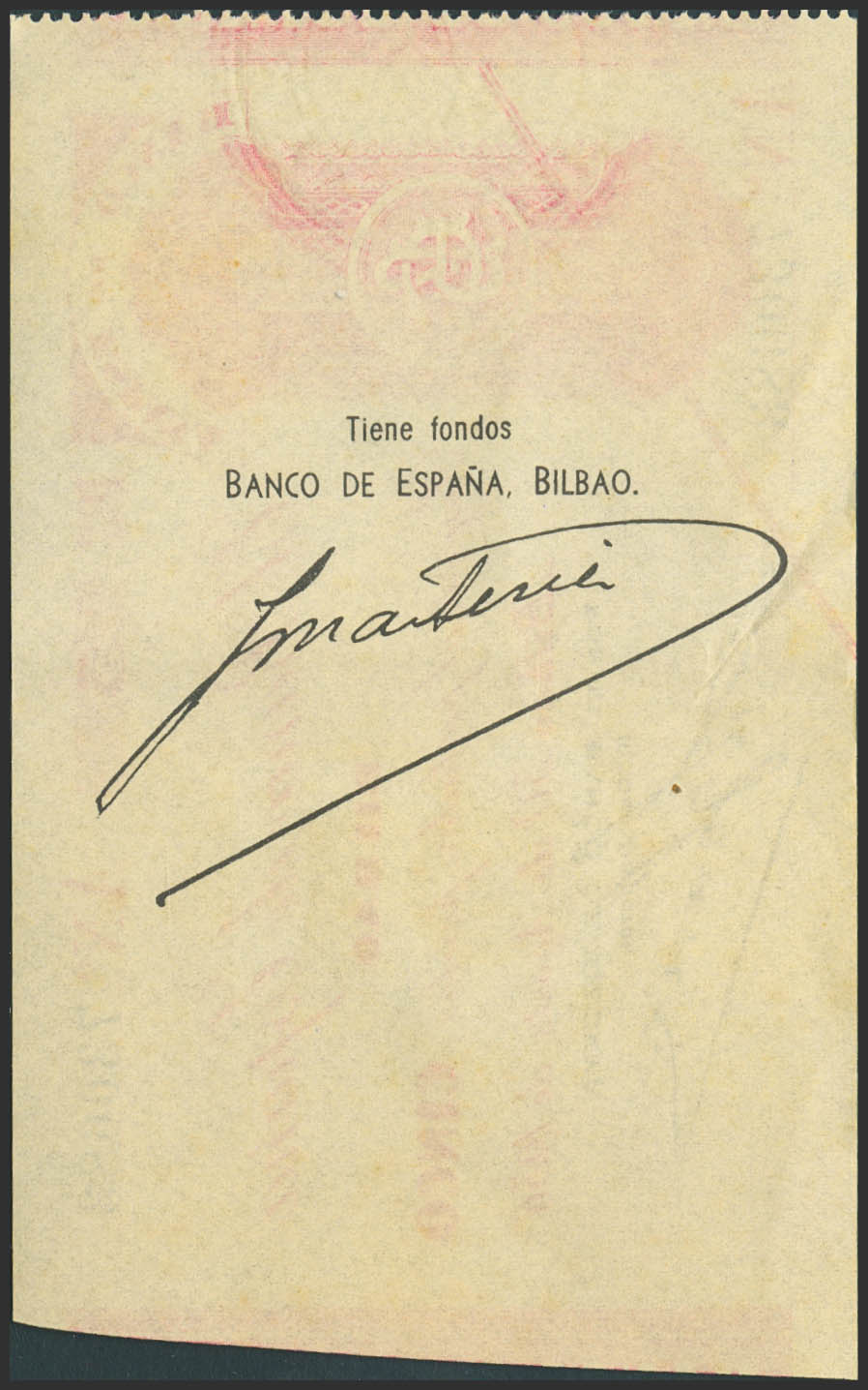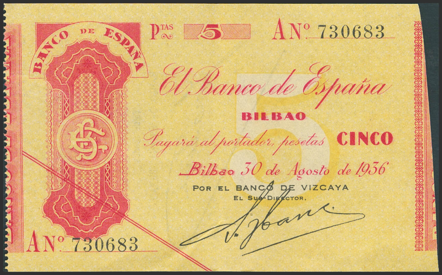5 Pesetas. 30 de Agosto de 1936. Sucursal de Bilbao, antefirma del Banco de Vizcaya. Serie A. (Edifil 2023: 368Aa). Inusual en esta excepcional calidad, especialmente con apresto original, ondulación que no llega a romper fibra. EBC+++.