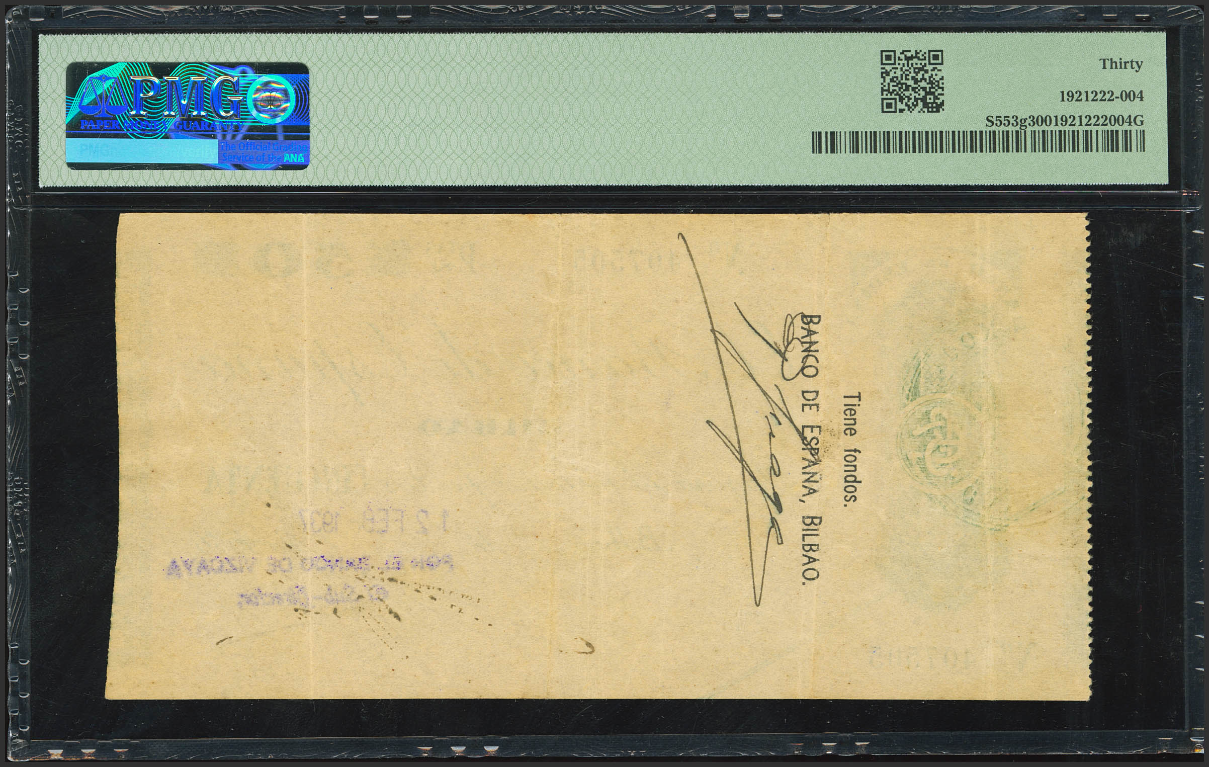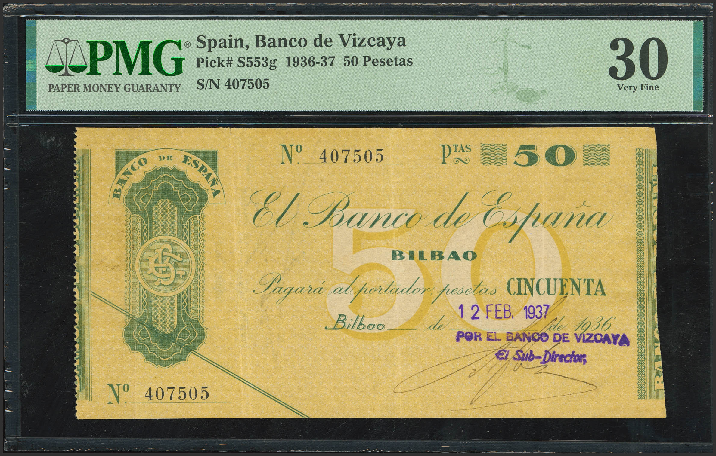 50 Pesetas. 1936. Sin serie. Sucursal de Bilbao y antefirma Banco de Vizcaya. (Edifil 2023: 370a, Pick: S553g). MBC. Encapsulado PMG30.