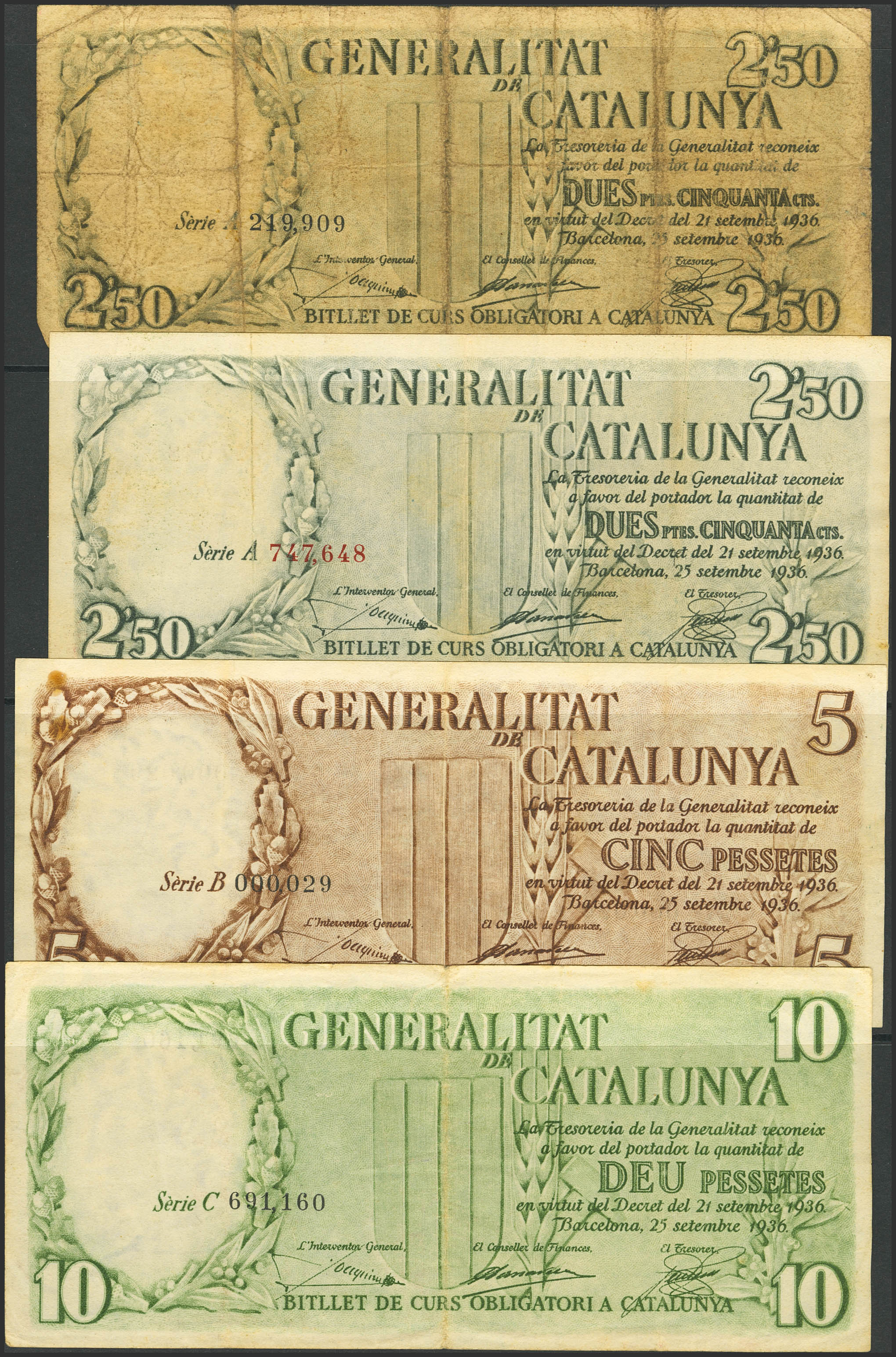 Serie completa de los 4 billetes de la Generalitat de Catalunya que incluye el 2´50 Pesetas (incluyendo la numeración en rojo y negro), 5 Pesetas (numeración bajísima 0000029, rarísimo) y 10 Pesetas, emitidos el 25 de Septiembre de 1936, con las series A (numeración roja y negra), B y C, respectivamente. (Edifil 2023: 372/74, 372a). MBC+.