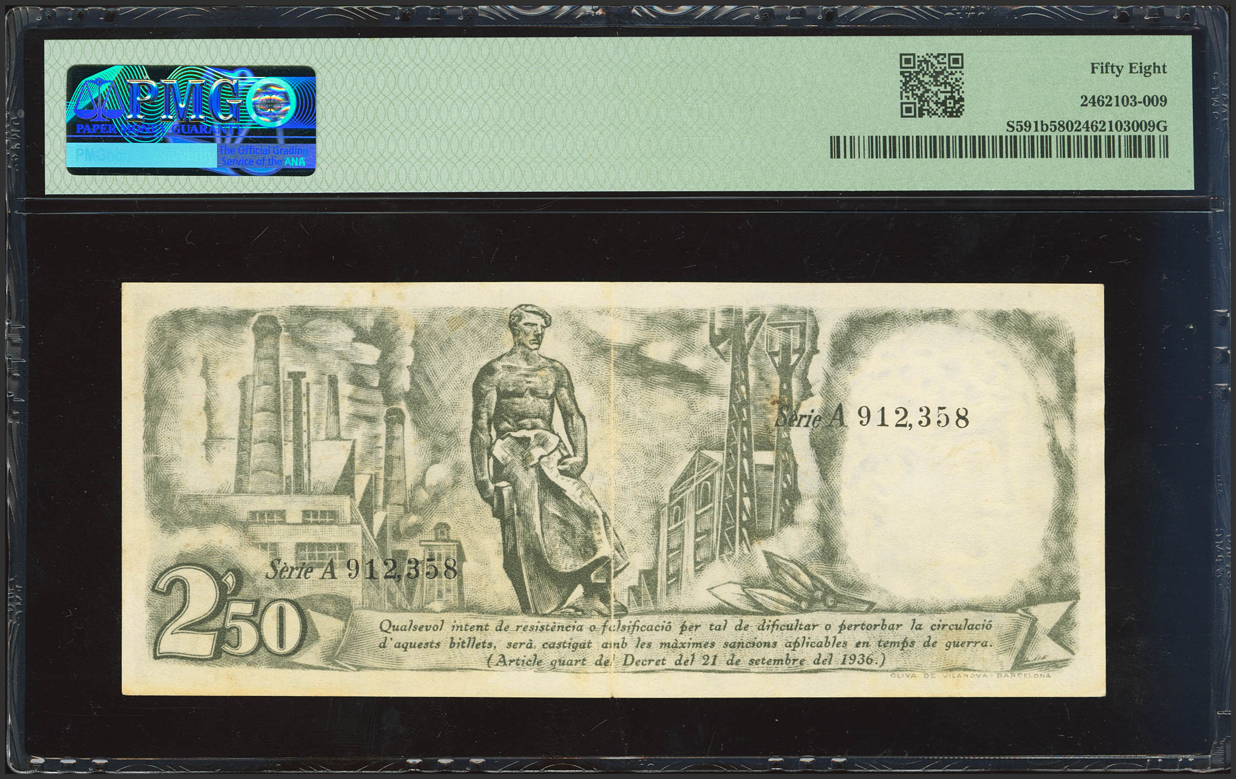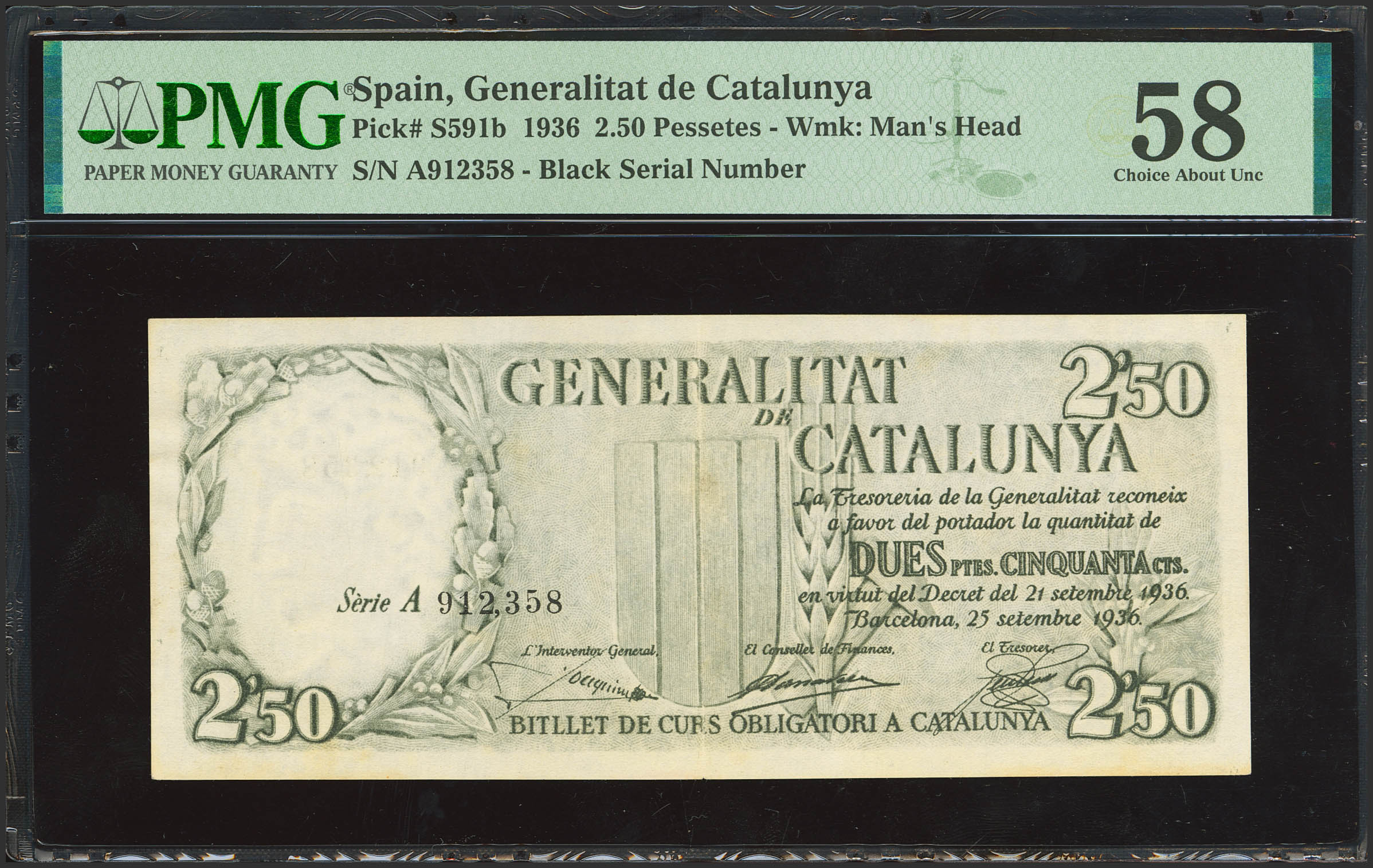 2´50 Pessetes. 25 de Septiembre de 1936. Generalitat de Catalunya. Serie A, en negro. (Edifil 2023: 372, Pick: S591b). Muy raro en esta calidad. EBC++. Encapsulado PMG58.