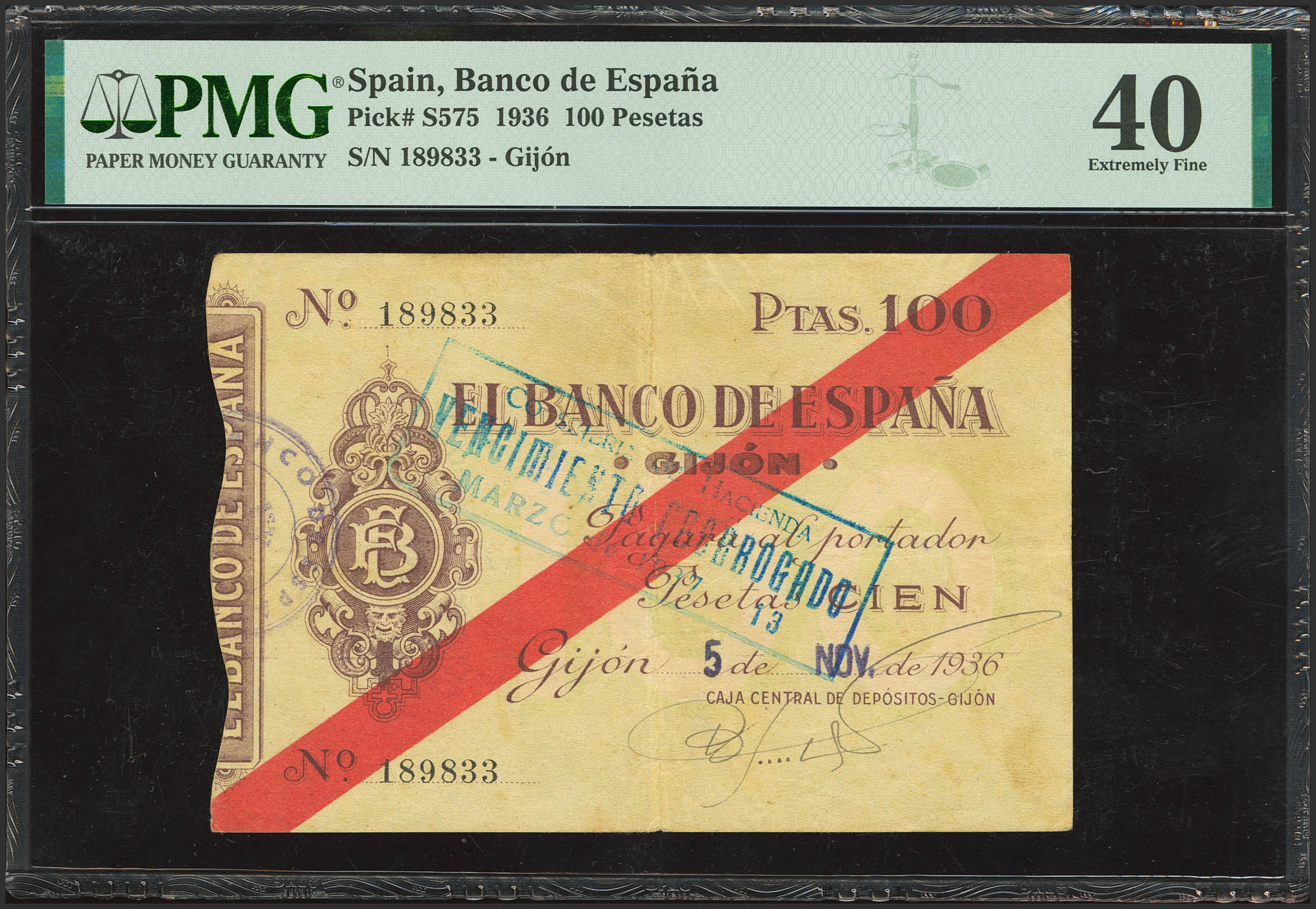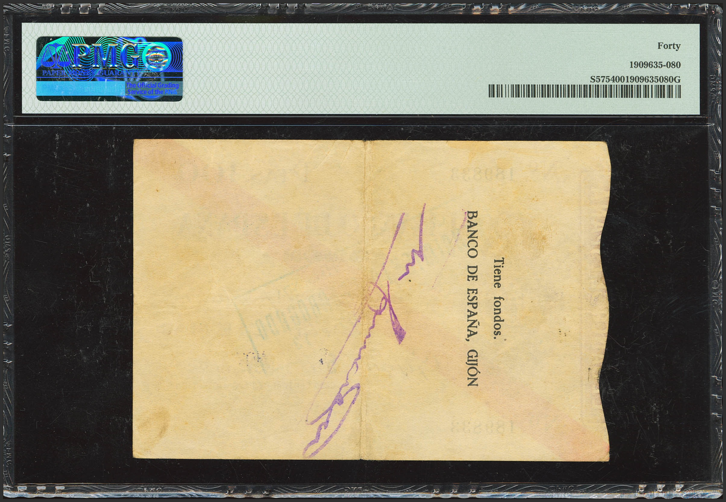 100 Pesetas. 5 de Noviembre de 1936. Sucursal de Banco de Gijón. Sin serie. (Edifil 2023: 384, Pick: S575). EBC-. Encapsulado PMG40.
