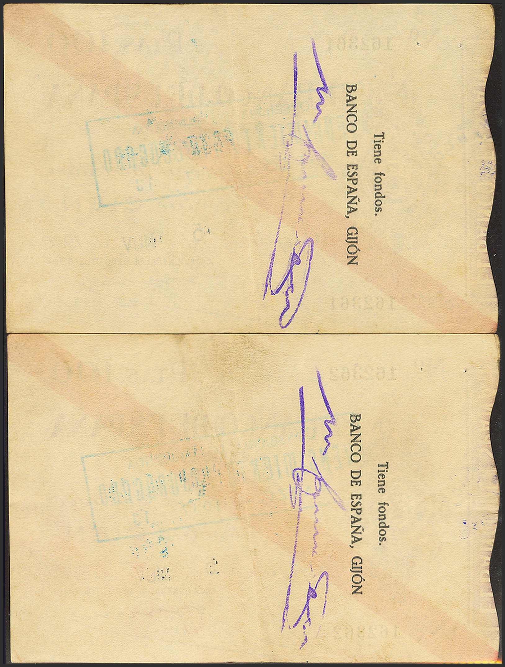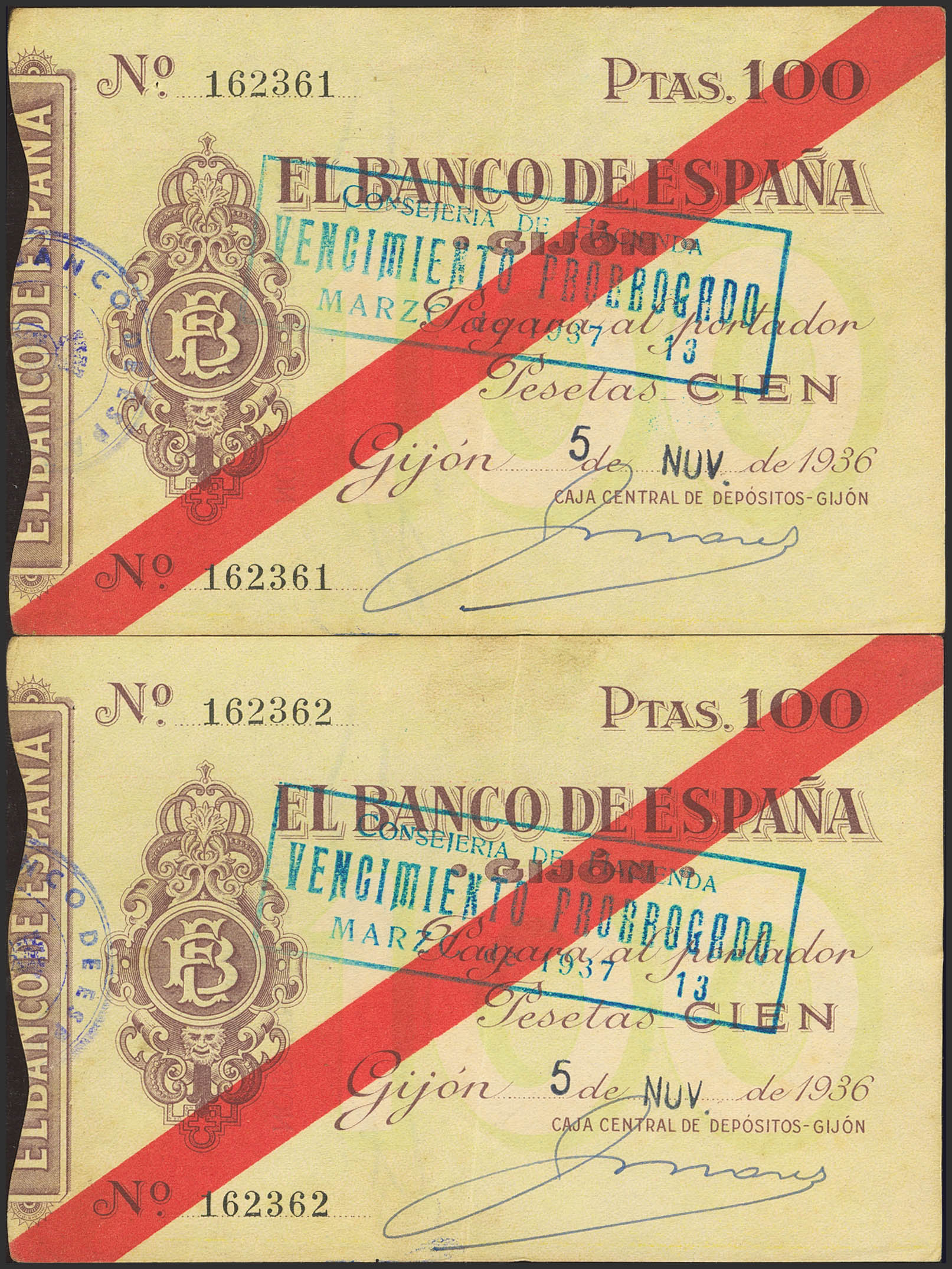 100 Pesetas. 5 de Noviembre de 1936. Sucursal de Gijón. Pareja correlativa. Sin serie. (Edifil 2021: 384). Rarísima pareja, especialmente en esta excepcional calidad para este billete, que siempre está en calidades bajas. EBC+.