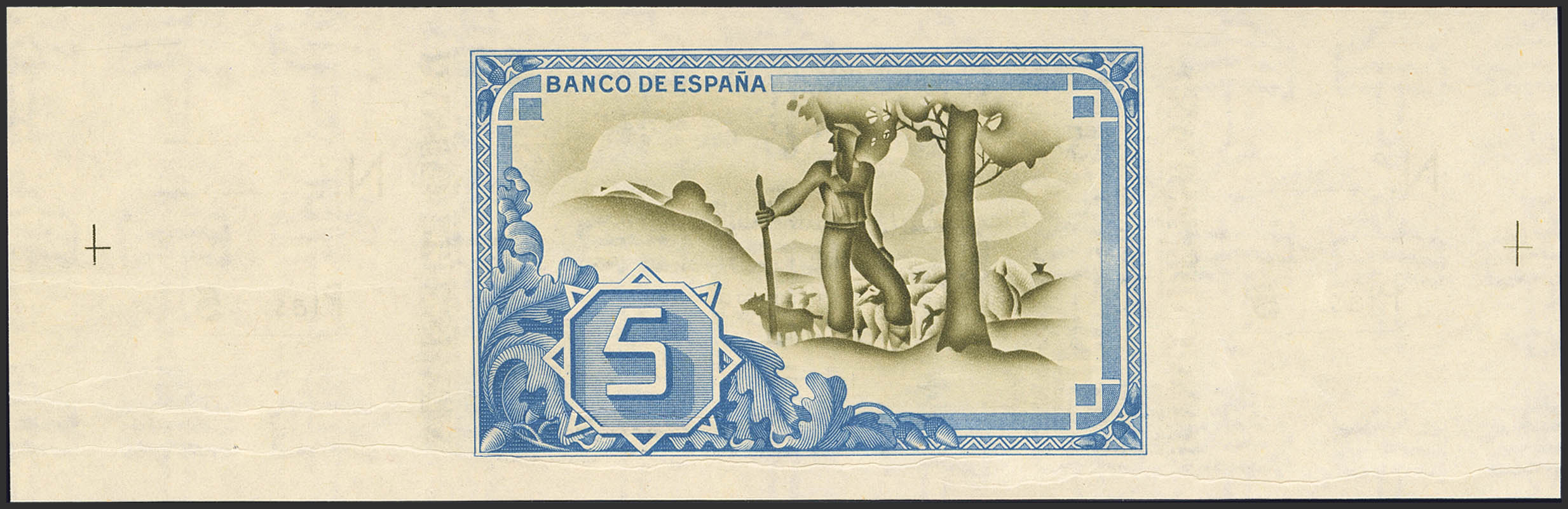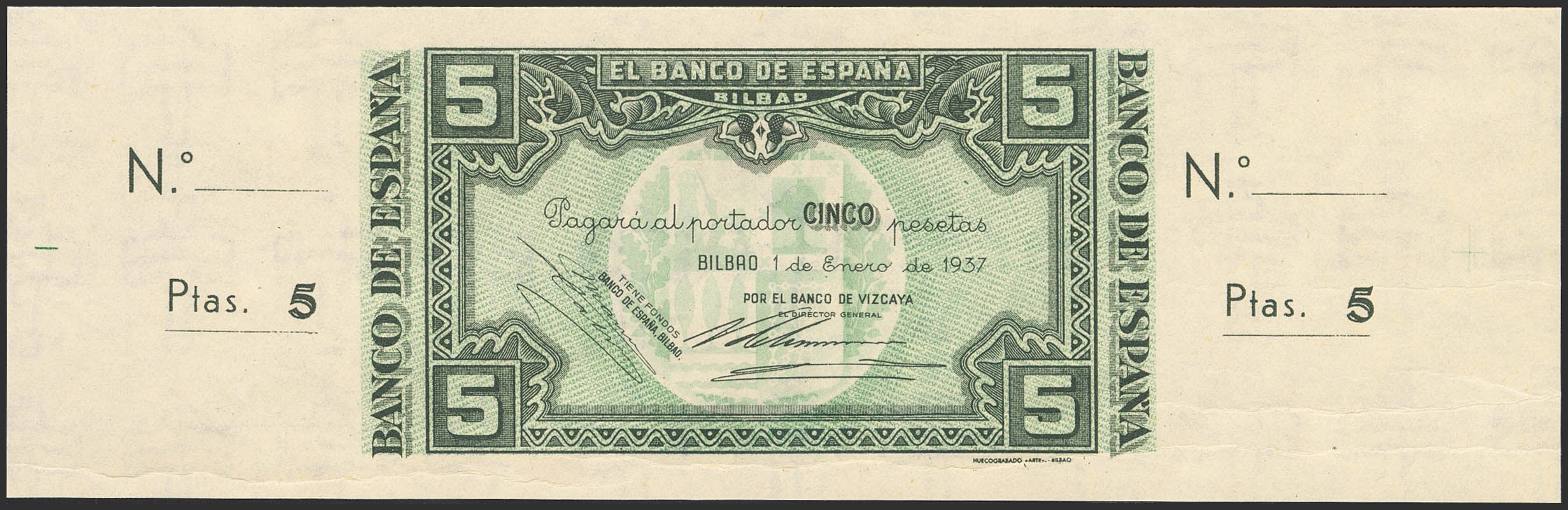 5 Pesetas. 1 de Enero de 1937. Sucursal de Bilbao, antefirma Banco de Vizcaya. Sin serie y sin numeración, con ambas matrices. (Edifil 2023: 385f). Apresto original, arruguitas naturales del papel. SC-.
