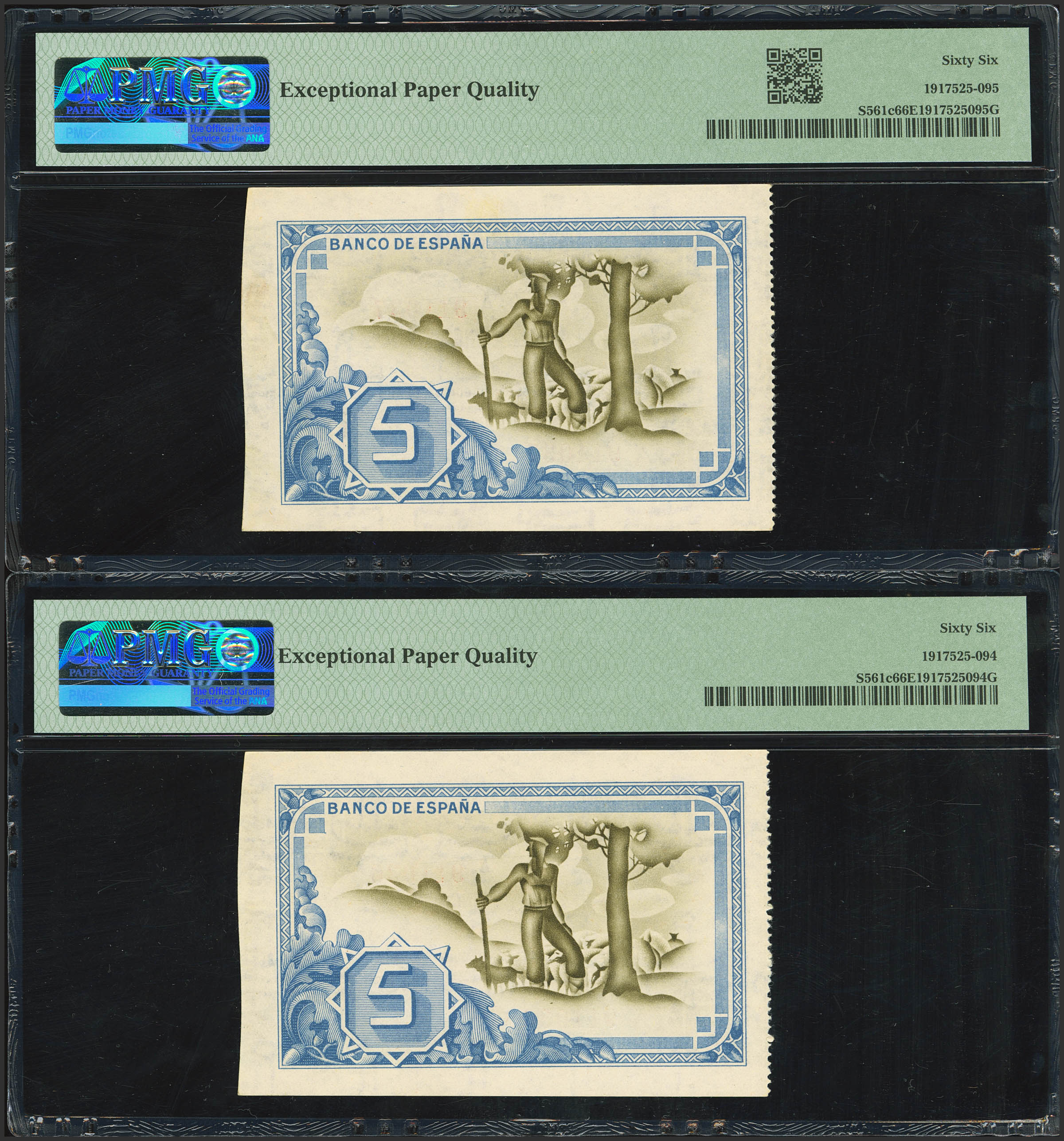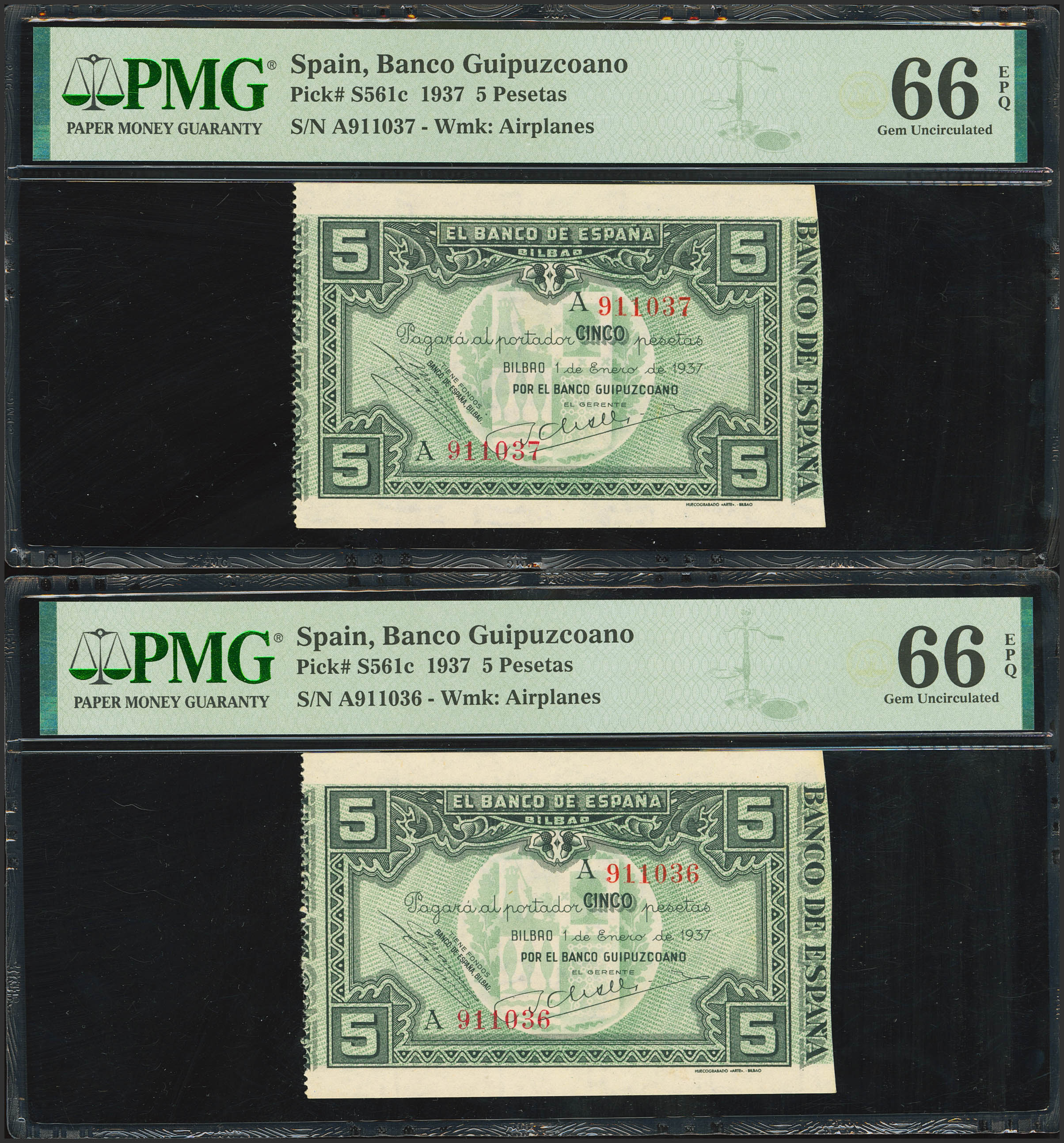 5 Pesetas. 1 de Enero de 1937. Pareja correlativa. Sucursal de Bilbao, antefirma Banco Guipuzcoano. Serie A, con numeración y sin matrices. (Edifil 2023: 386c, Pick: S561c). Apresto original. SC. Encapsulados PMG66EPQ, ambos.