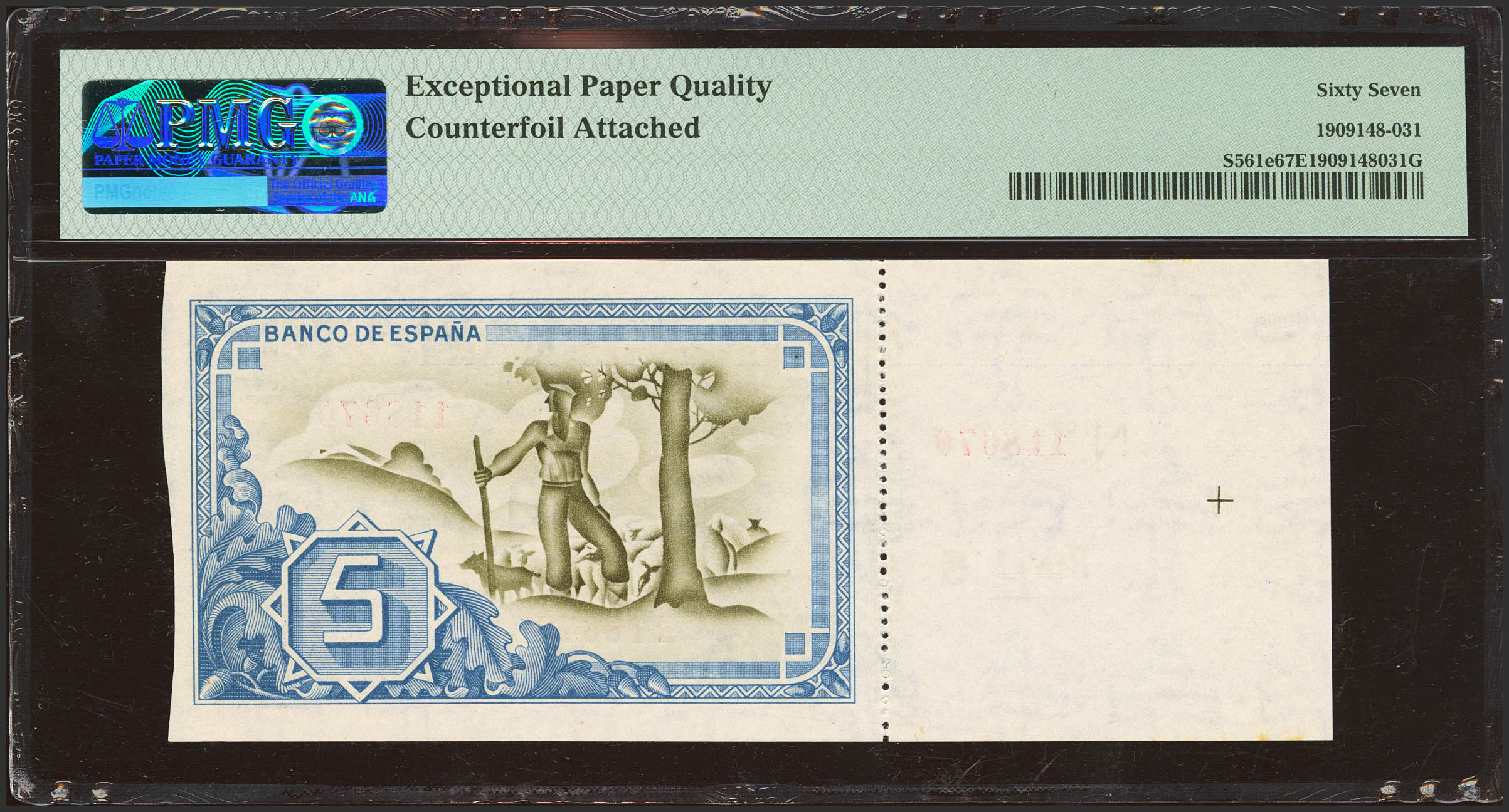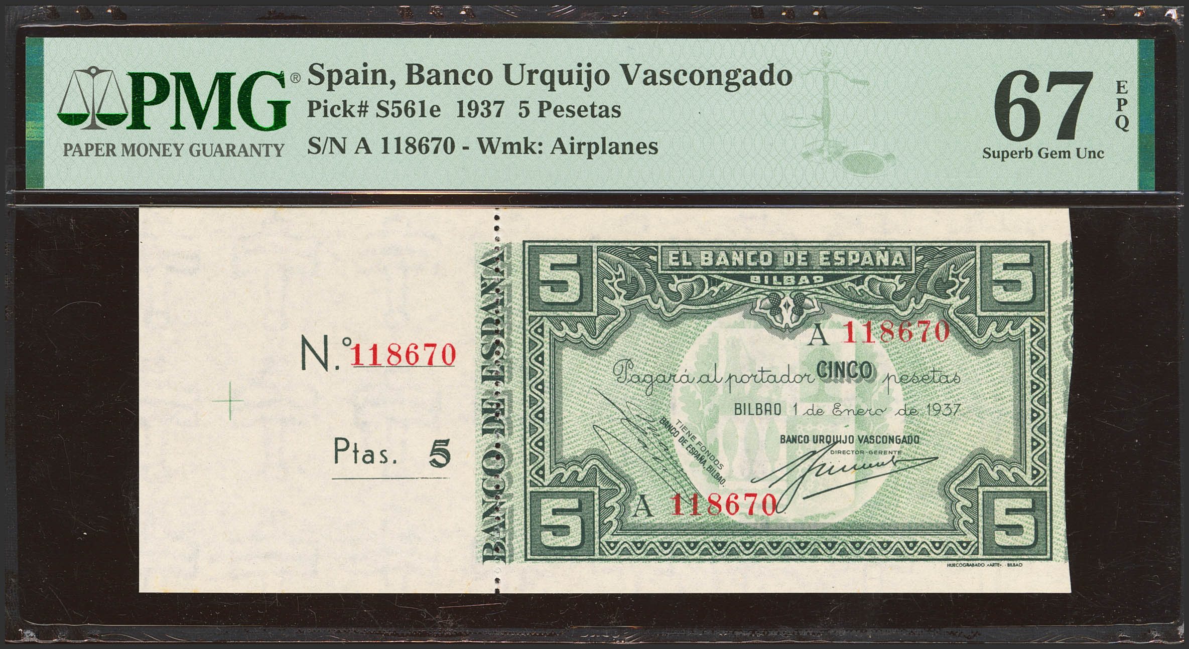 5 Pesetas. 1 de Enero de 1937. Serie A y antefirma Banco Urquijo Vascongado, matriz a la izquierda. (Edifil 2023: 386f, Pick: S561e). Apresto original. SC. Encapsulado PMG67EPQ.