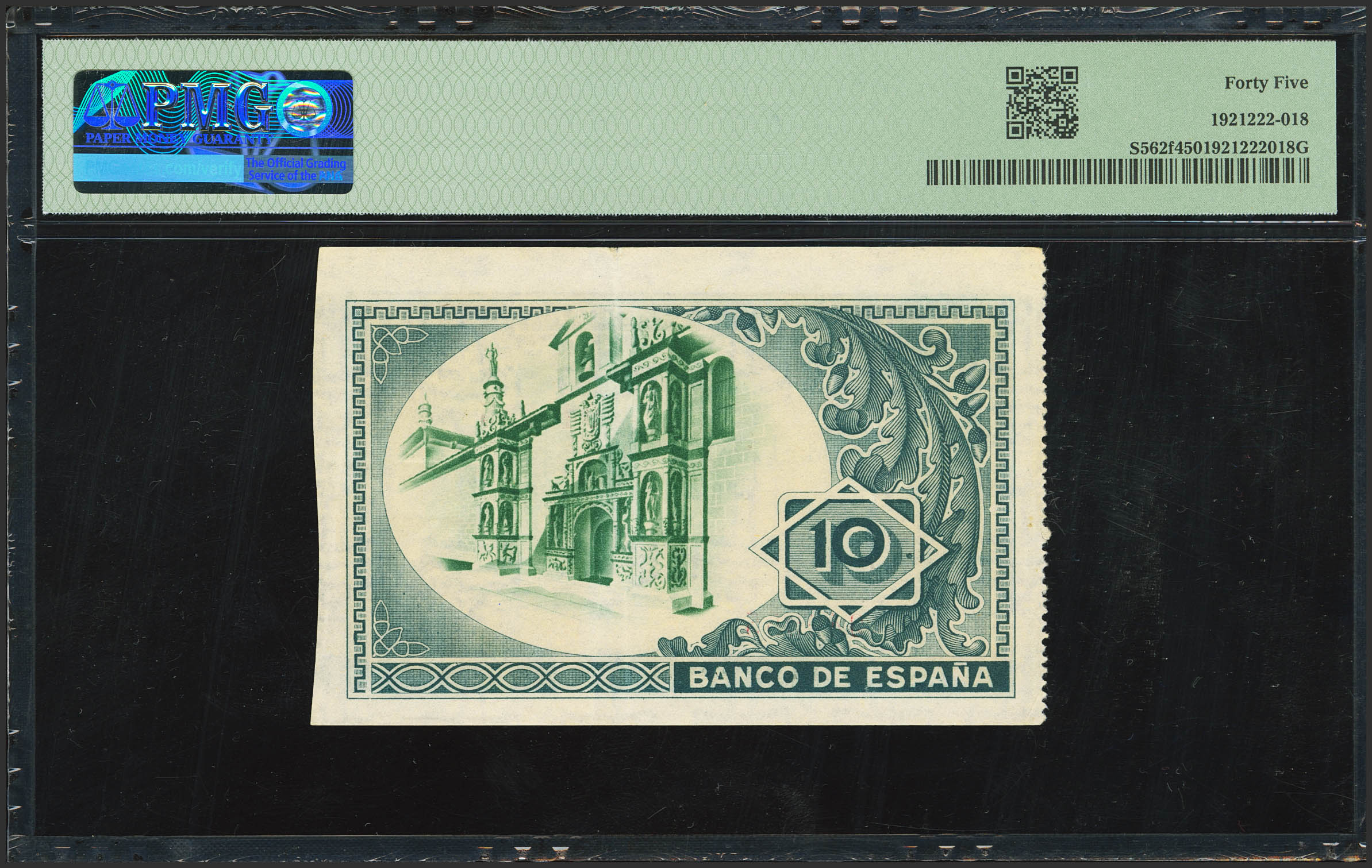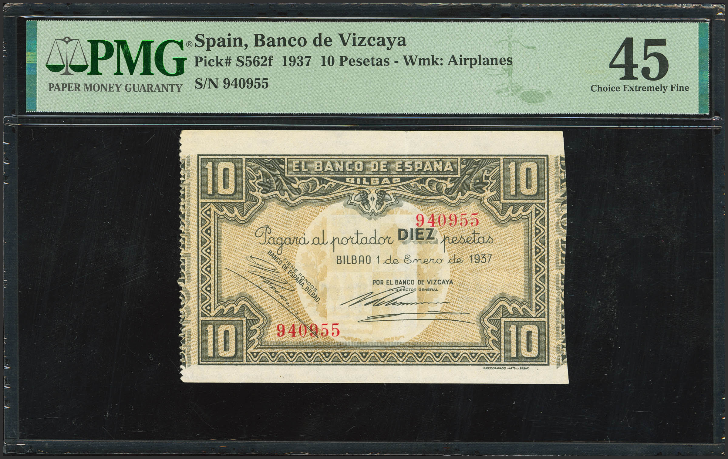 10 Pesetas. 1 de Enero de 1937. Sucursal de Bilbao, antefirma Banco de Vizcaya. Sin serie, con numeración y sin matrices. (Edifil 2023: 387b, Pick: S562f). EBC-. Encapsulado PMG45.