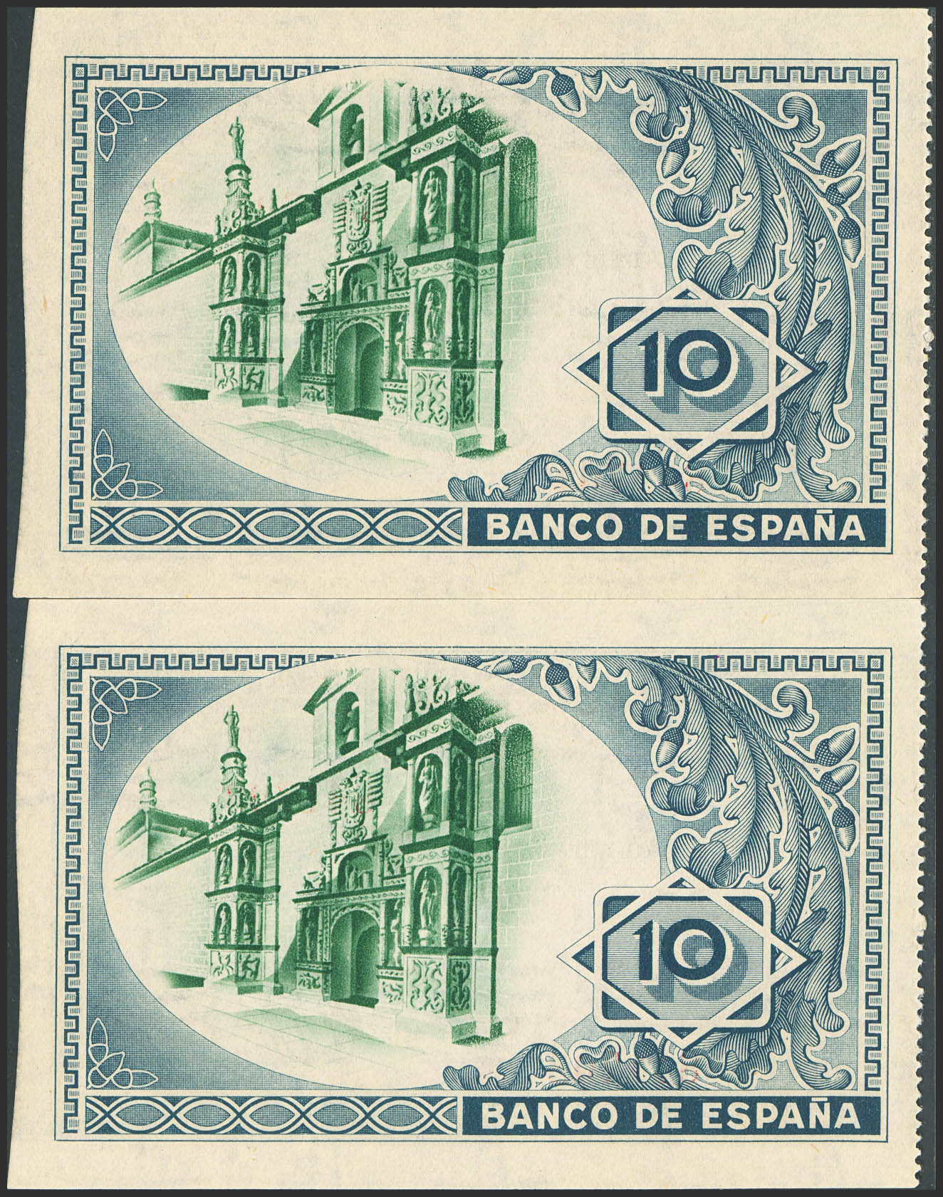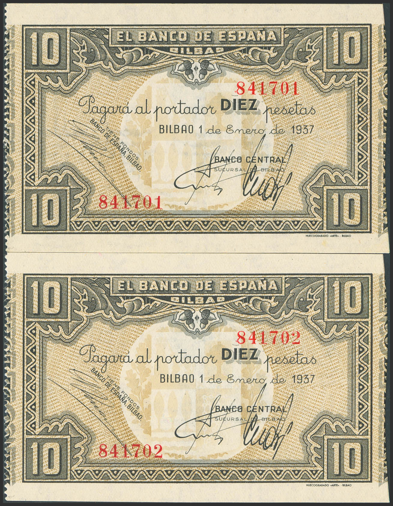 10 Pesetas. 1 de Enero de 1937. Sucursal de Bilbao, antefirma Banco Central. Pareja correlativa. Sin serie, con numeración y sin matrices. (Edifil 2023: 387c). Apresto original. SC.