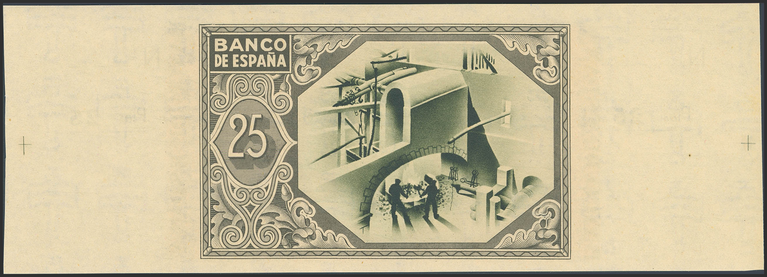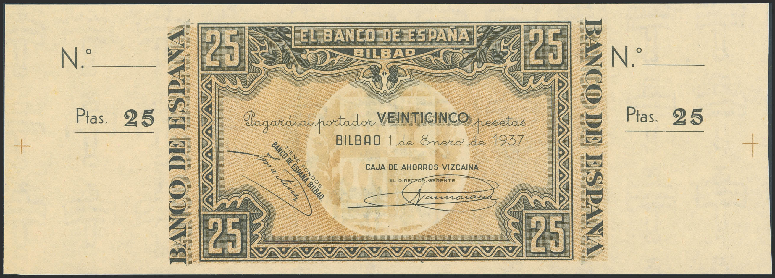 25 Pesetas. 1 de Enero de 1937. Sucursal de Bilbao, antefirma Caja de Ahorros Vizcaína. Sin serie y sin numeración, con ambas matrices. (Edifil 2023: 388a). Apresto original, habituales puntitos del tiempo. SC-.