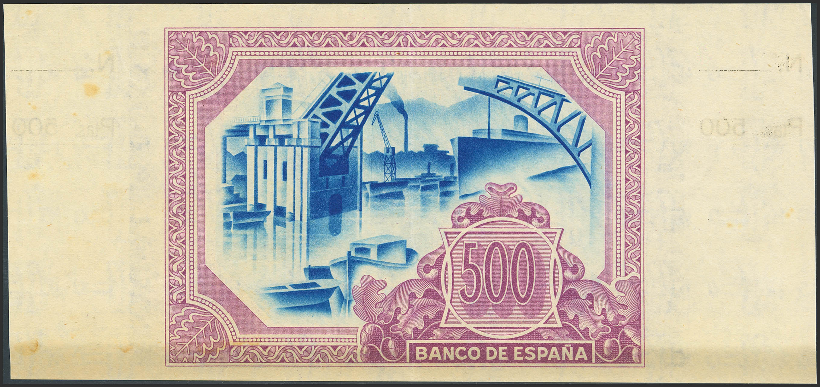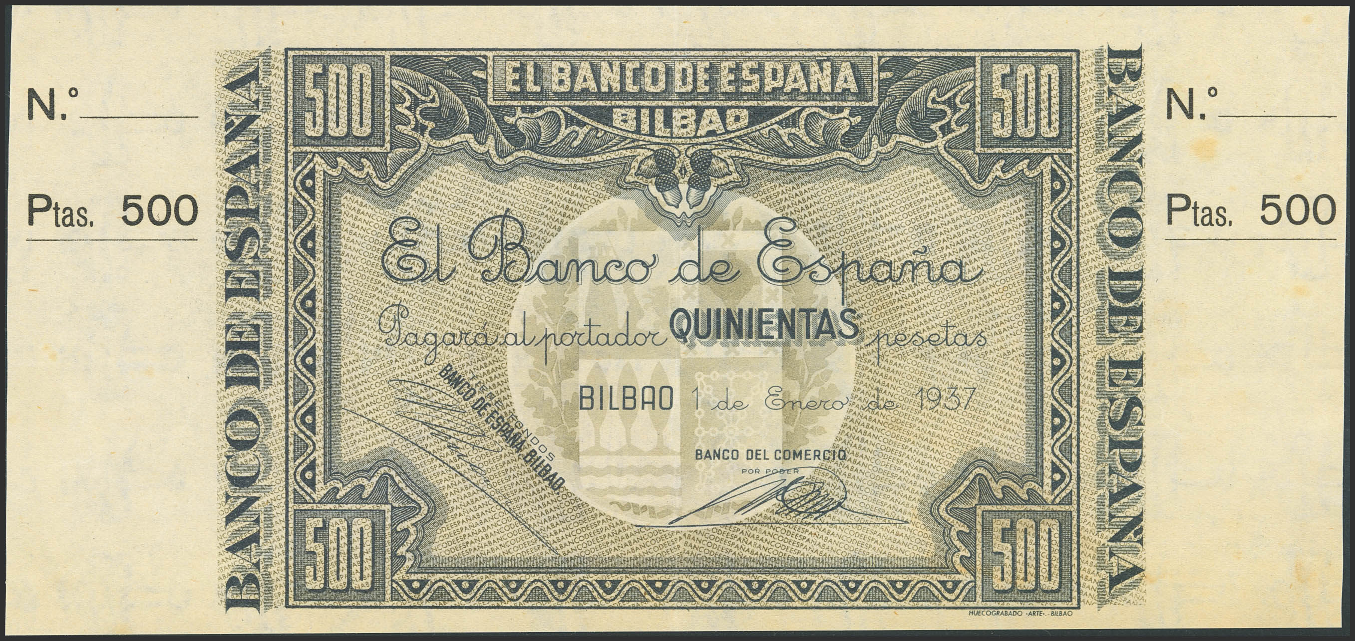 500 Pesetas. 1 de Enero de 1937. Sucursal de Bilbao, antefirma Banco del comercio. No emitido, sin serie, sin numeración y con ambas matrices. (Edifil 2023: NE26c). Raro. EBC.