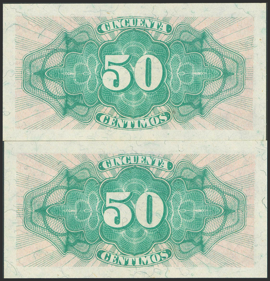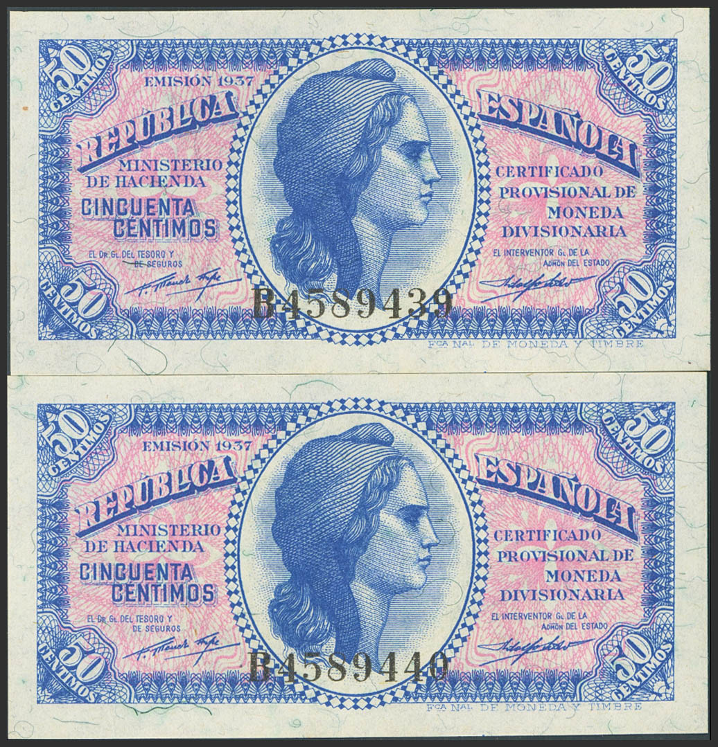 50 Céntimos. 1937. Ministerio de Hacienda. Pareja correlativa. Serie B. (Edifil 2023: 391). Apresto original. SC.