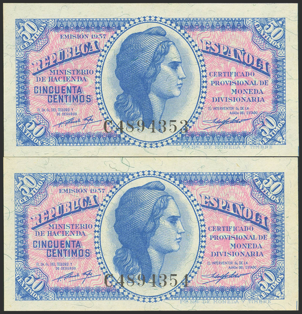 50 Céntimos. 1937. Pareja correlativa. Serie C. (Edifil 2023: 391a). Apresto original. SC.