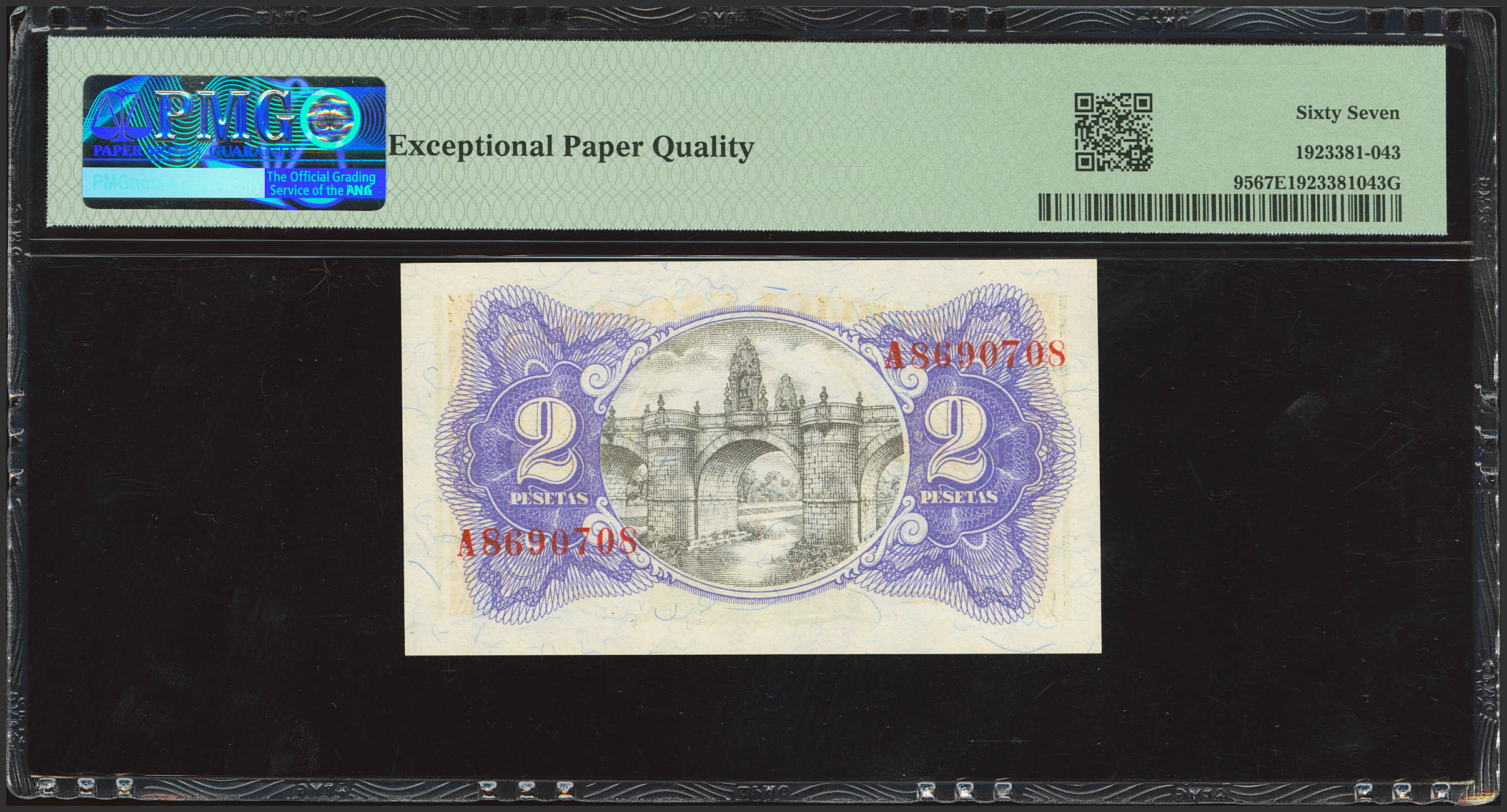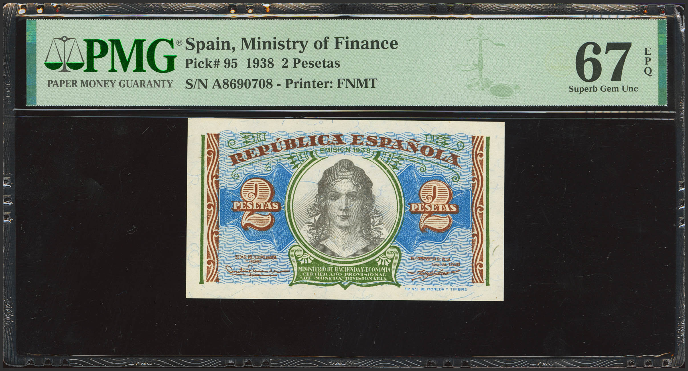 2 Pesetas. 1938. Serie A. (Edifil 2023: 393, Pick: 95). Apresto original. SC. Encapsulado PMG67EPQ.