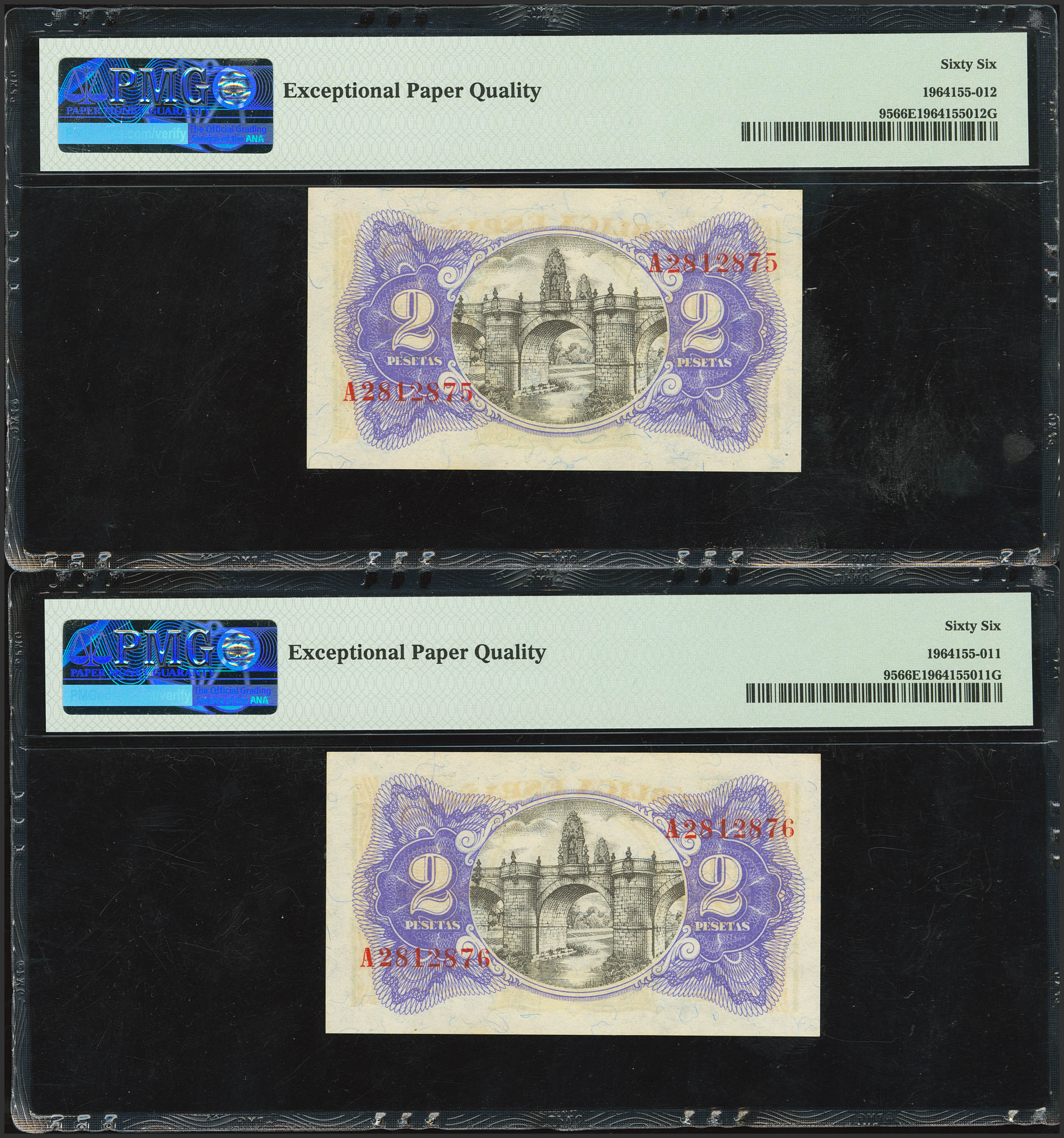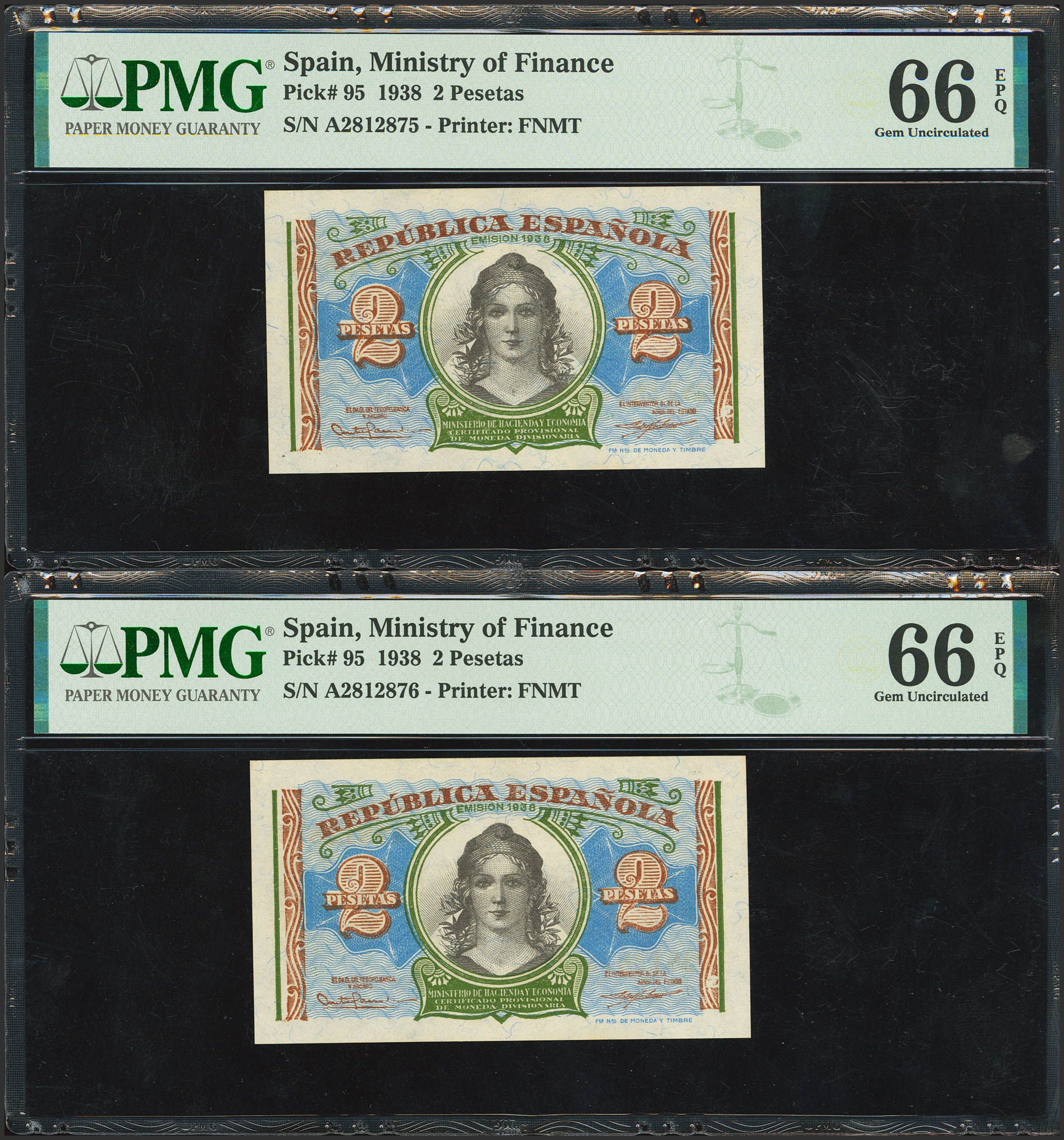 2 Pesetas. 1938. Pareja correlativa. Serie A. (Edifil 2023: 393, Pick: 95). Apresto original. SC. Encapsulados PMG66EPQ, ambos.