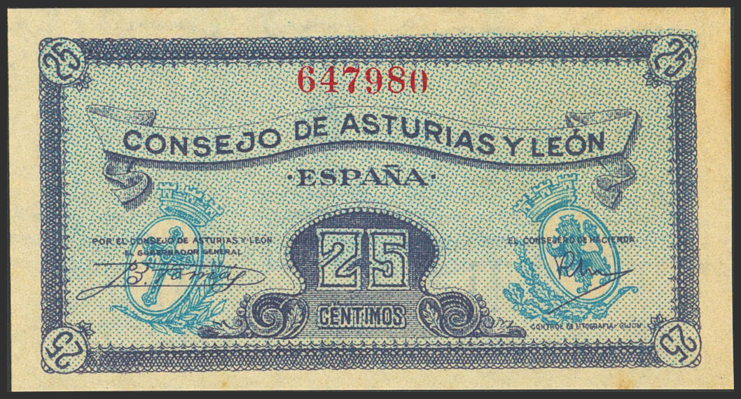 25 Céntimos. 1937. Asturias y León. Sin serie. (Edifil 2023: 394). Apresto original, manchitas del tiempo. SC-.