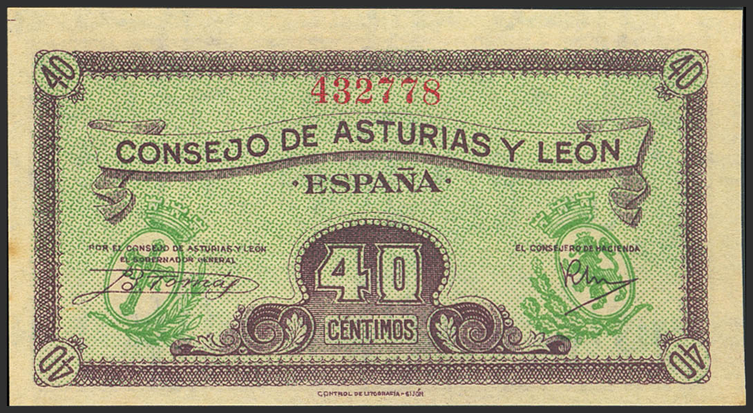 40 Céntimos. 1937. Asturias y León. Sin serie. (Edifil 2023: 395). Apresto original, habituales manchitas del tiempo. SC-.