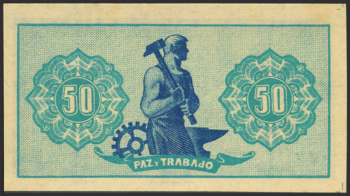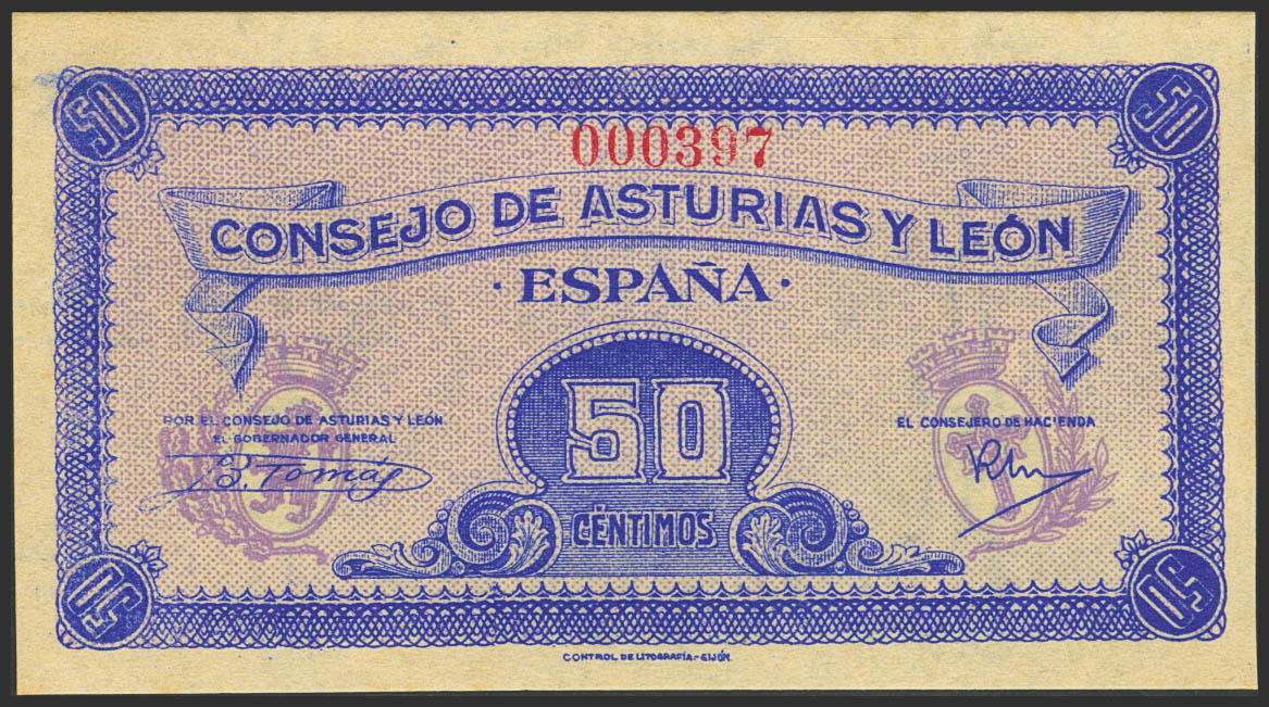 50 Céntimos. 1937. Asturias y León. Sin serie y numeración baja (Nº000397). (Edifil 2023: 396). Muy raro en esta calidad, apresto original. SC.