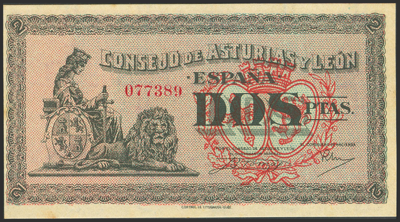 2 Pesetas. 1937. Asturias y León. Sin serie. (Edifil 2023: 398). Apresto original, habituales puntitos del tiempo. SC-.