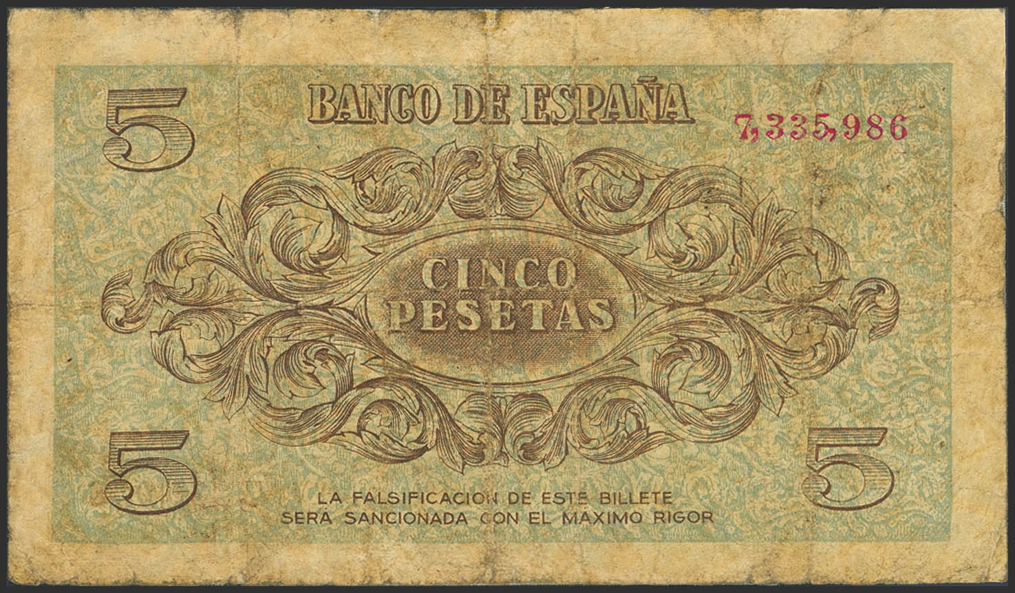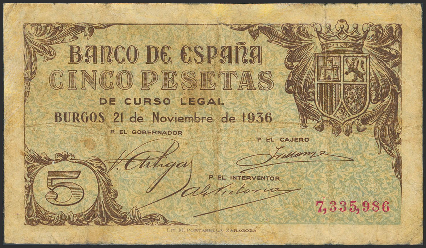 5 Pesetas. 21 de Noviembre de 1936. Sin serie. (Edifil 2023: 417). Reparado. BC.