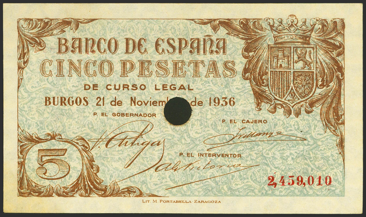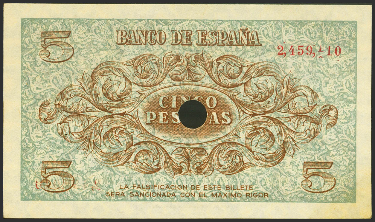 5 Pesetas. 21 de Noviembre de 1936. Sin serie y taladrado. (Edifil 2021: 417T). Inusual, puntitos de grapa siempre presentes en los billetes taladrados. SC-.
