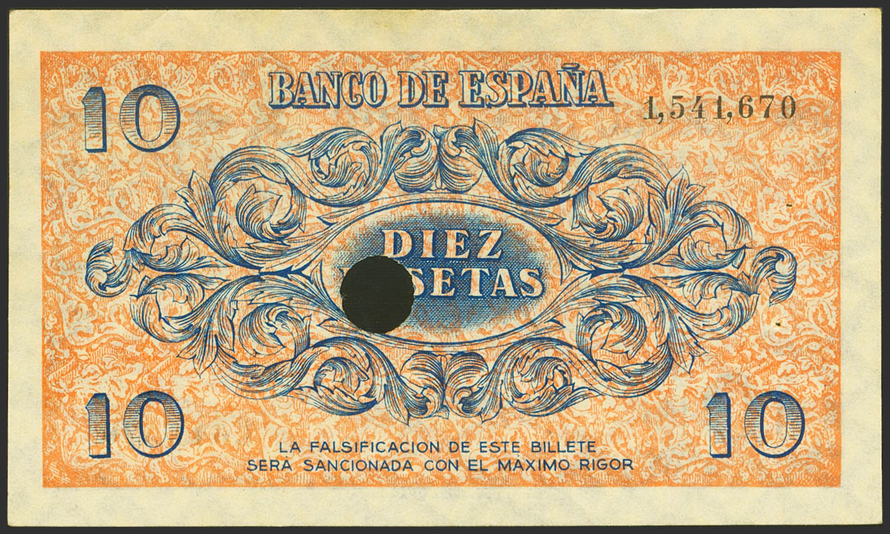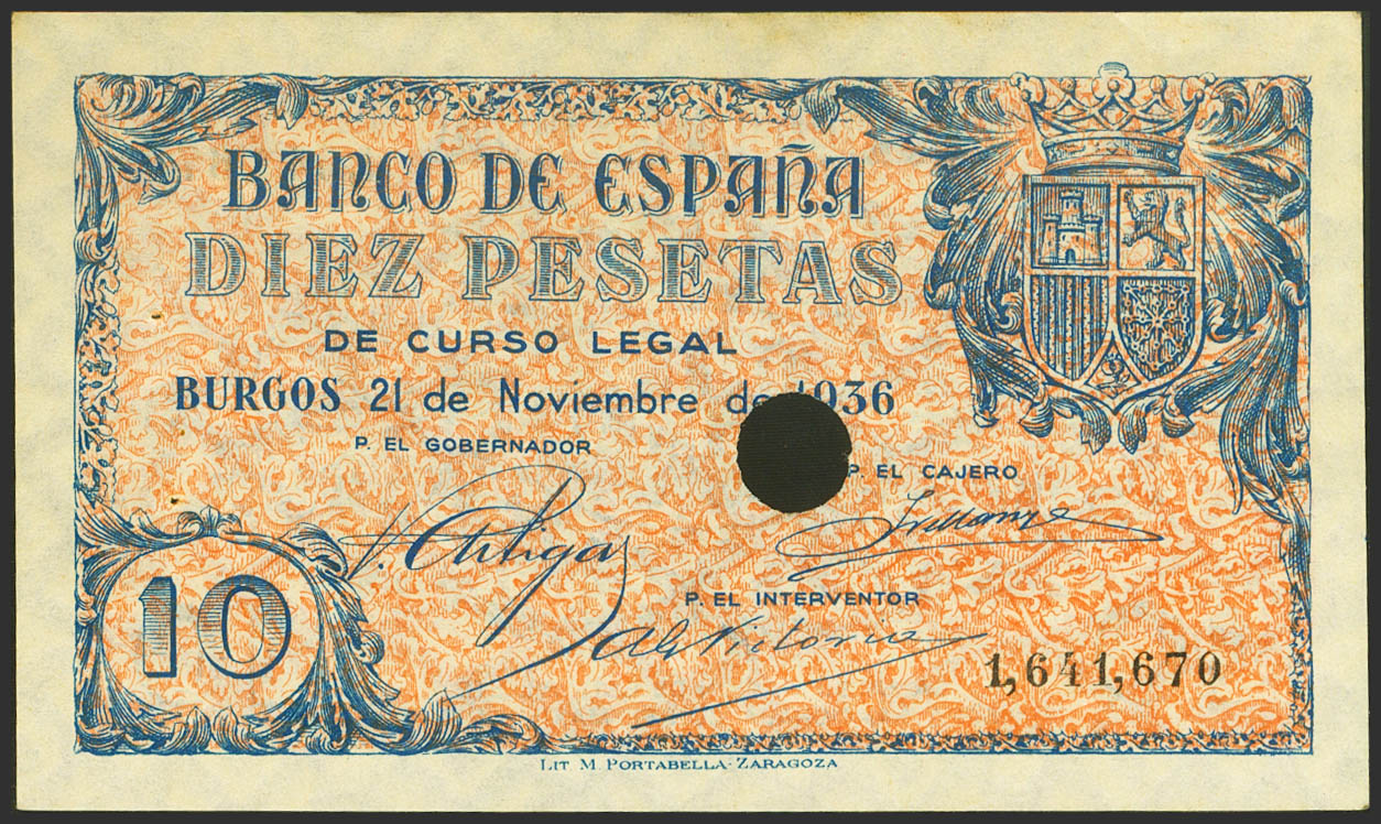 10 Pesetas. 21 de Noviembre de 1936. Sucursal de Burgos. Taladrado (doble) con numeración y sin serie. (Edifil 2021: 418T). Raro, puntitos de grapa sin ninguna importancia, como todos los conocidos. SC-.