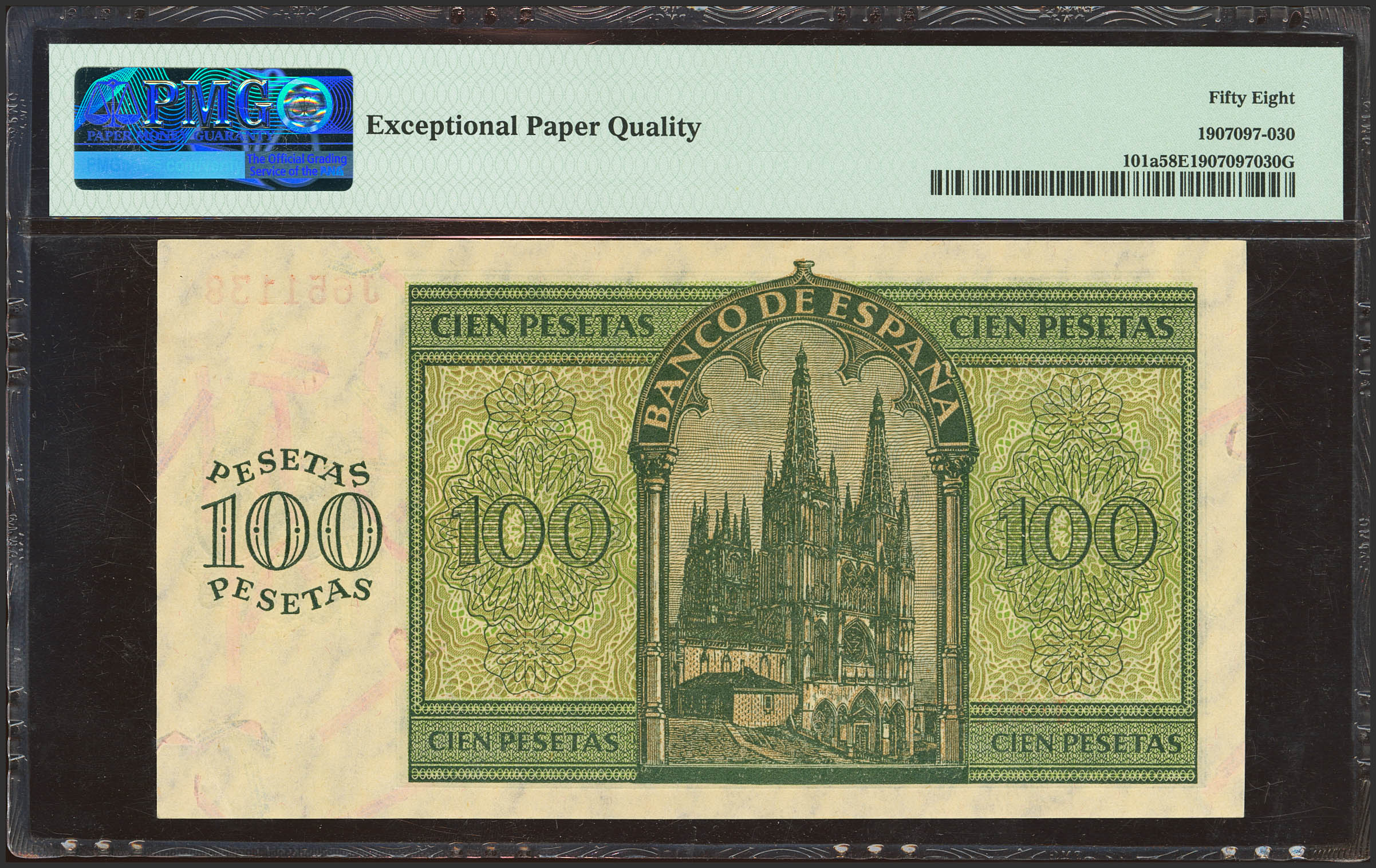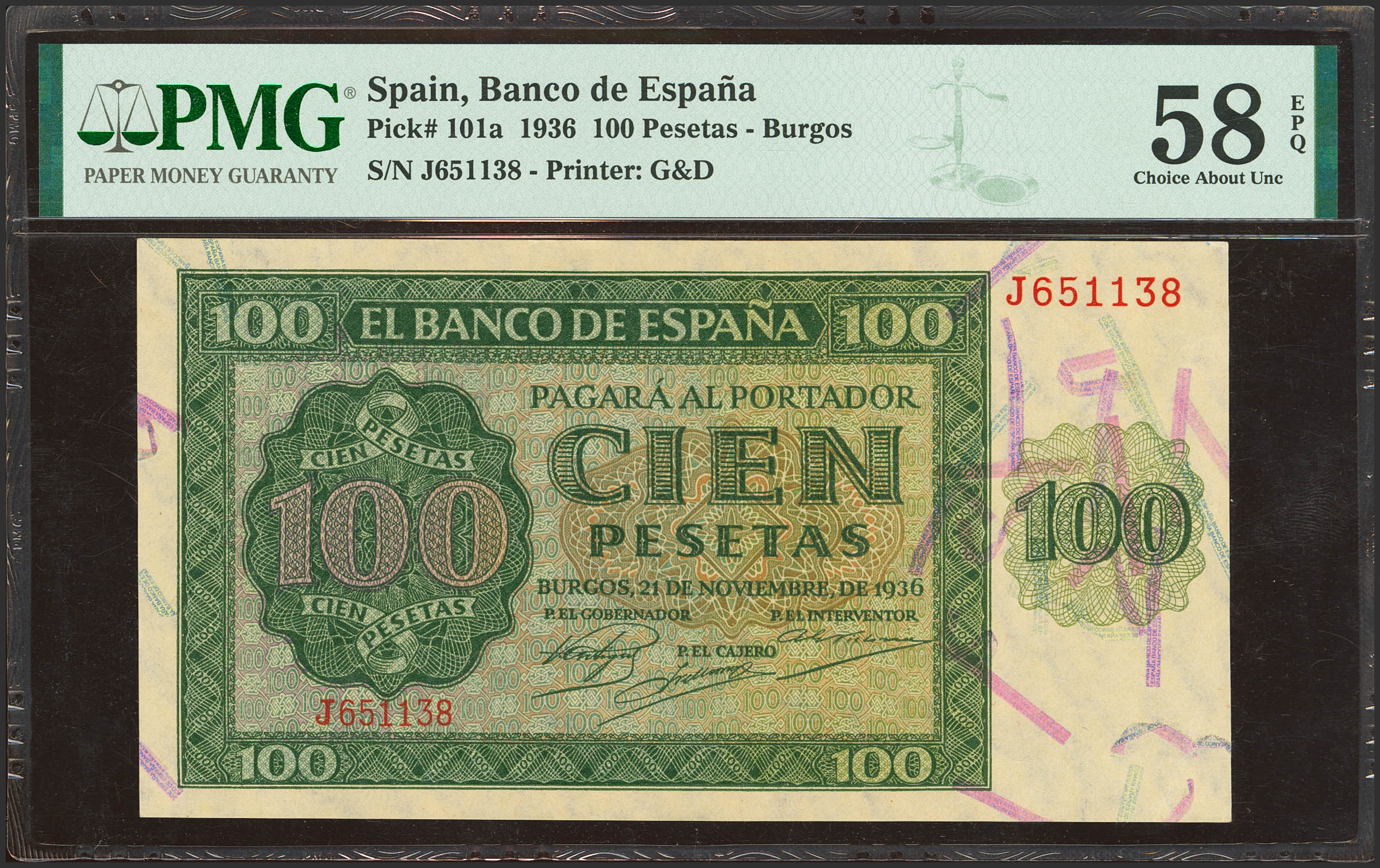 100 Pesetas. 21 de Noviembre de 1936. Serie J. (Edifil 2023: 421a). Apresto original. EBC+++. Encapsulado PMG58EPQ.