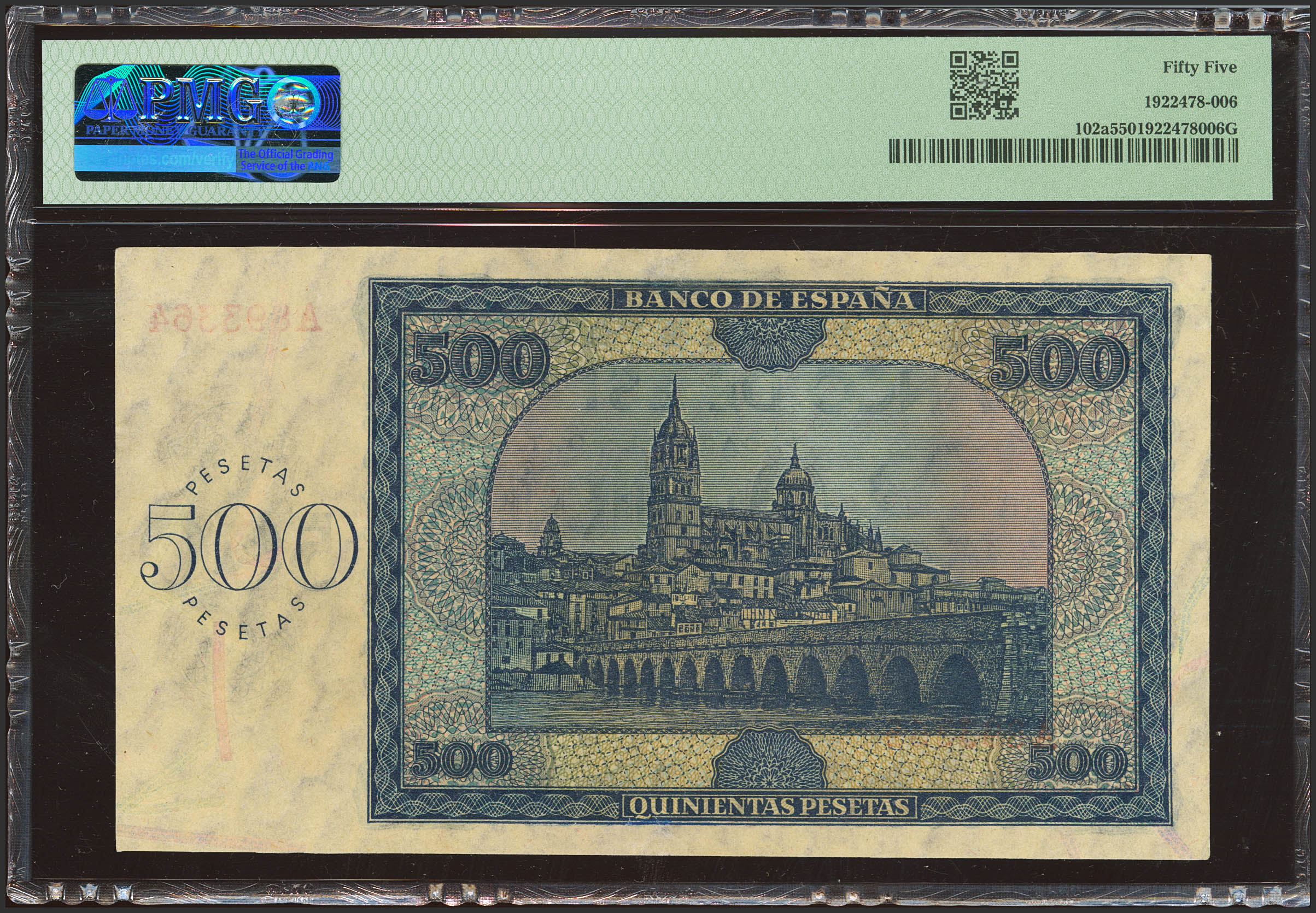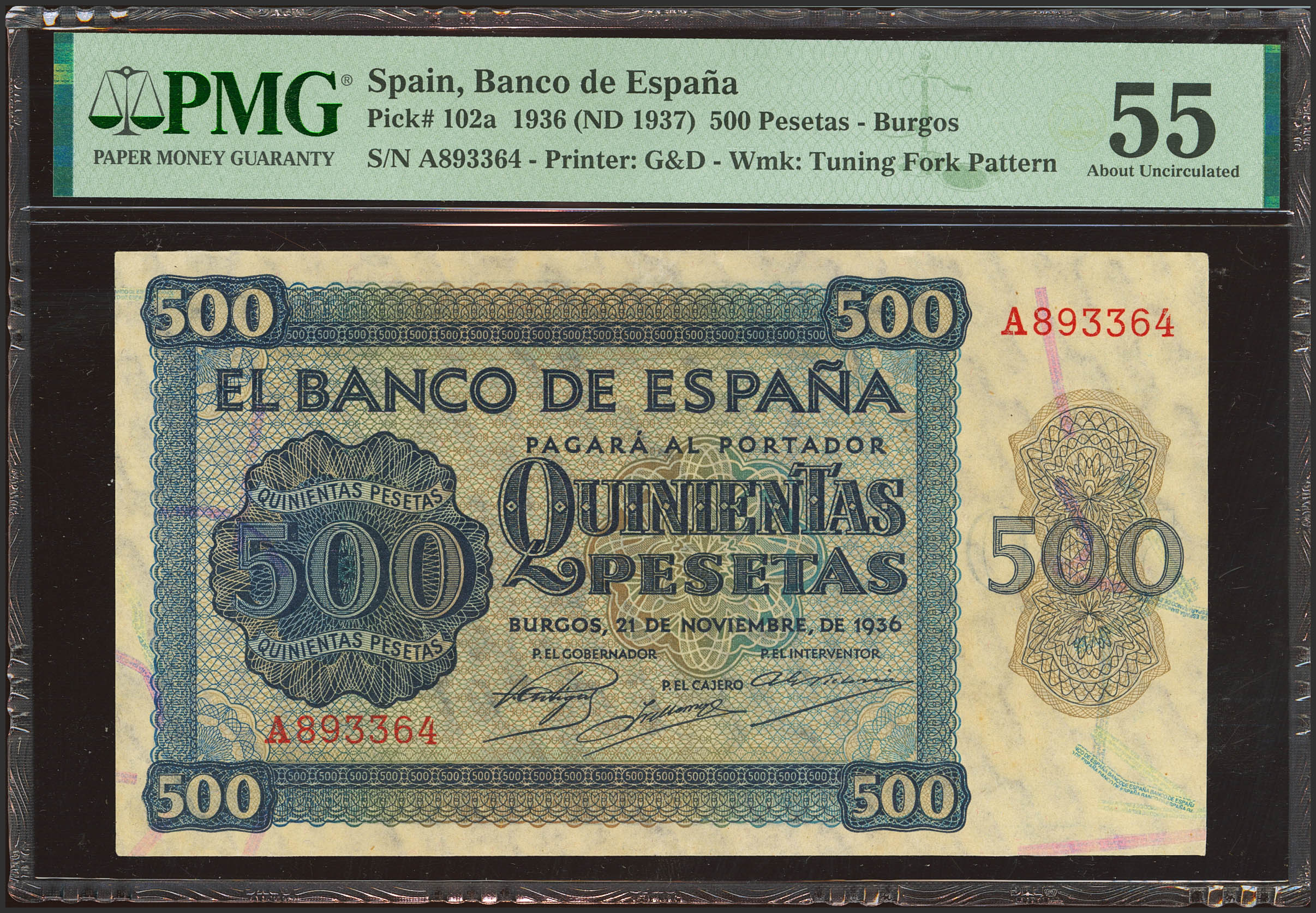500 Pesetas. 21 de Noviembre de 1936. Serie A. (Edifil 2023: 422, Pick: 102a). Inusual. EBC++. Encapsulado PMG55.