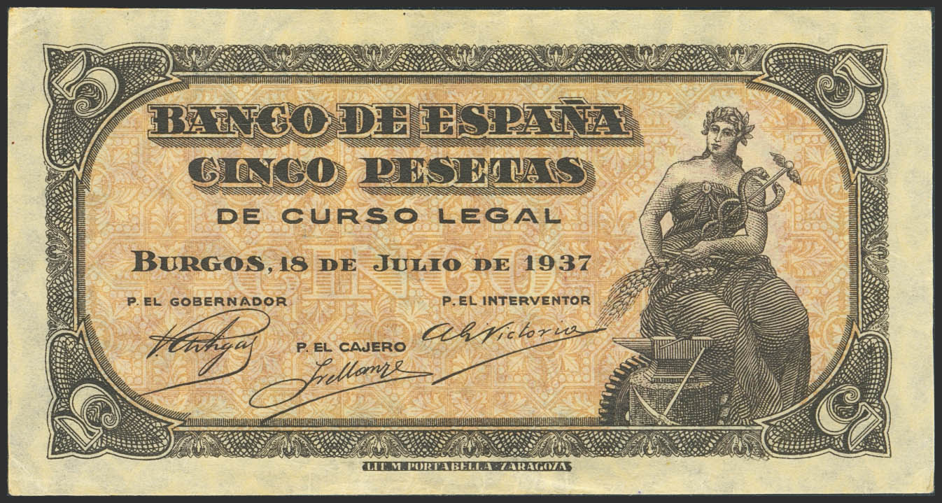 5 Pesetas. 18 de Julio de 1937. Sin serie. (Edifil 2023: 424). Apresto original. SC--.