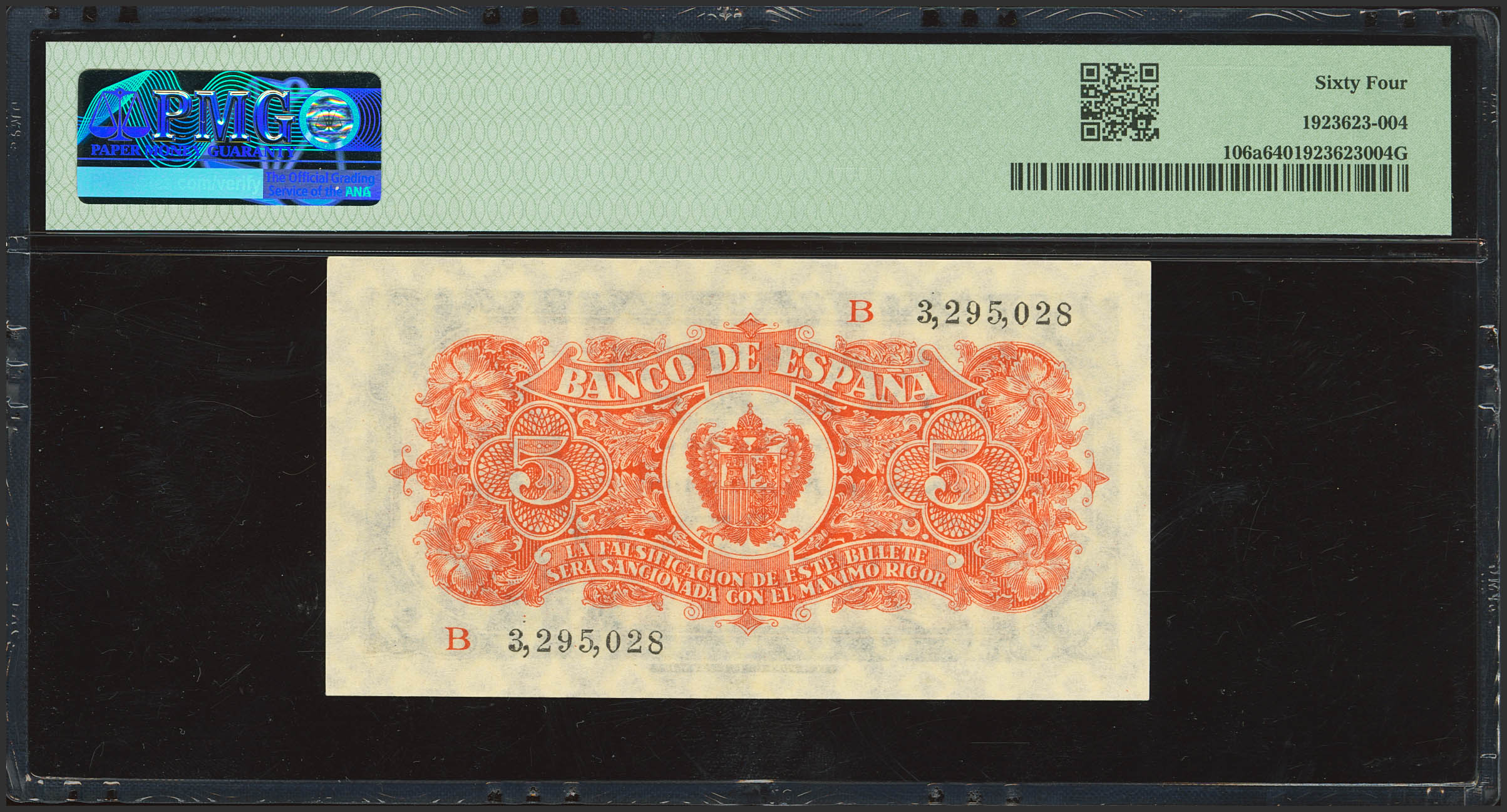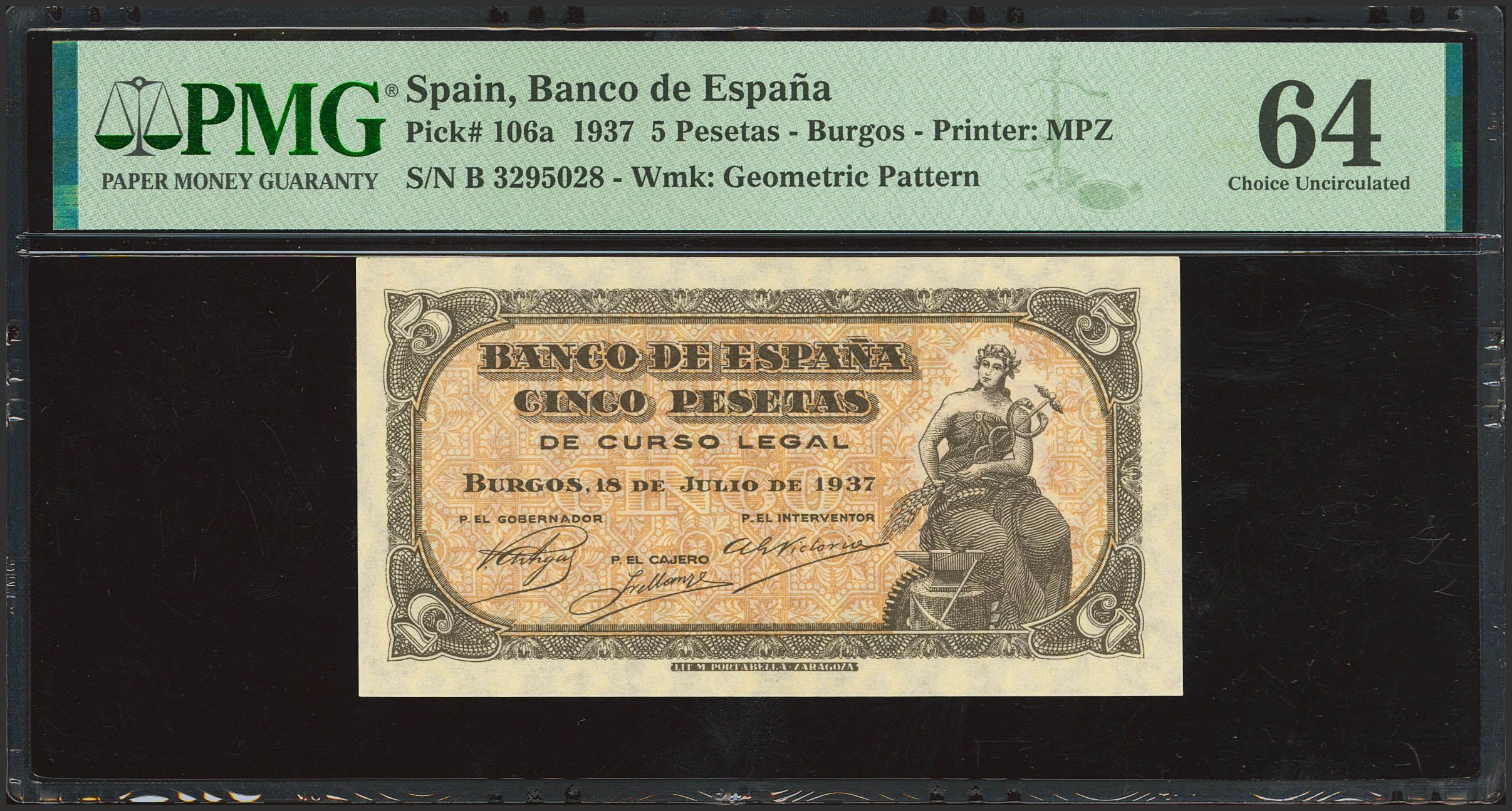 5 Pesetas. 18 de Julio de 1937. Serie B. (Edifil 2023: 424a, Pick: 106a). SC. Encapsulado PMG64.