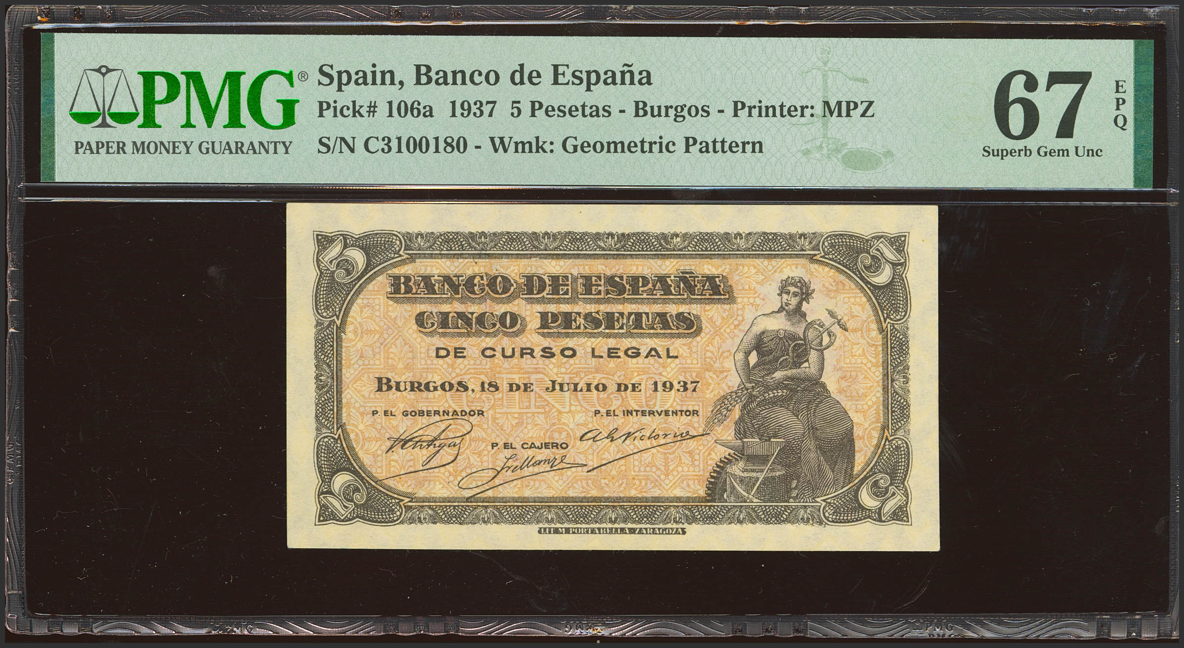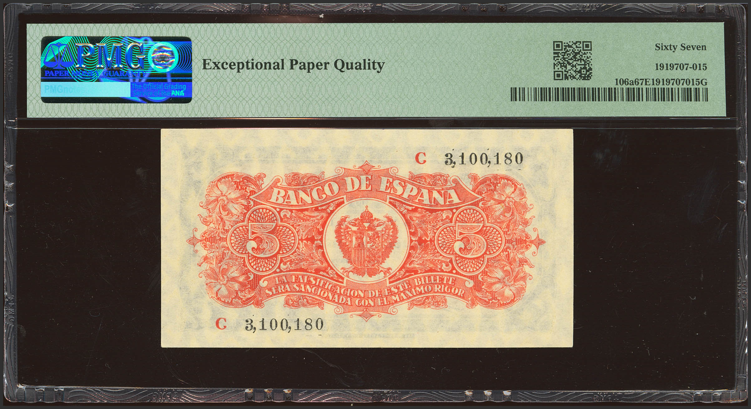 5 Pesetas. 18 de Julio de 1937. Serie C, última serie emitida. (Edifil 2023: 424b, Pick: 106a). Muy raro en esta excepcional calidad, apresto original. SC. Encapsulado PMG67EPQ.