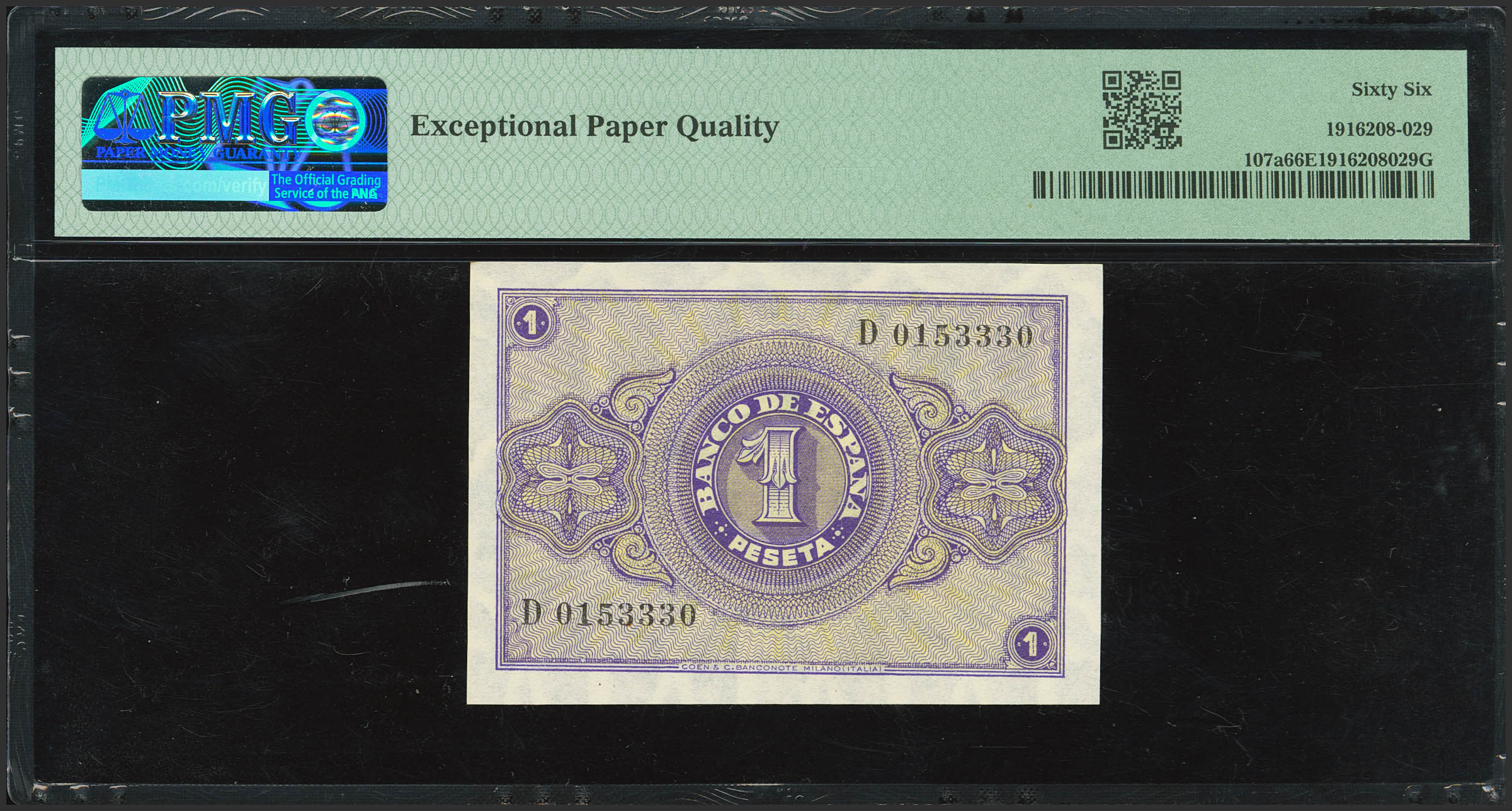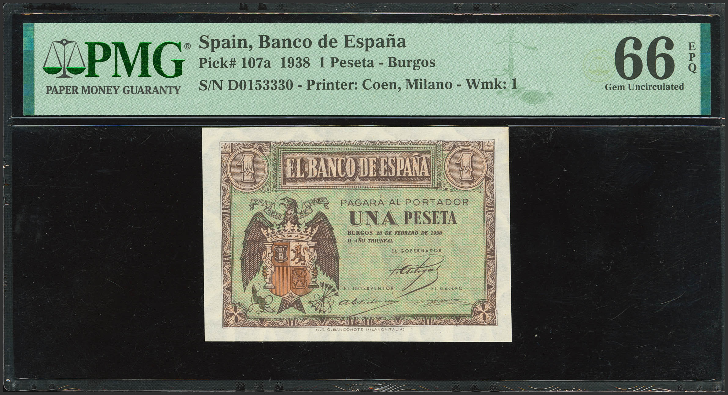 1 Peseta. 28 de Febrero de 1938. Serie D. (Edifil 2023: 427a, Pick: 107a). Raro en esta excepcional calidad, apresto original. SC. Encapsulado PMG66EPQ.