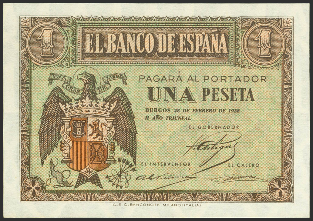 1 Peseta. 28 de Febrero de 1938. Serie E. (Edifil 2021: 427a). Conserva todo su apresto original. SC-.