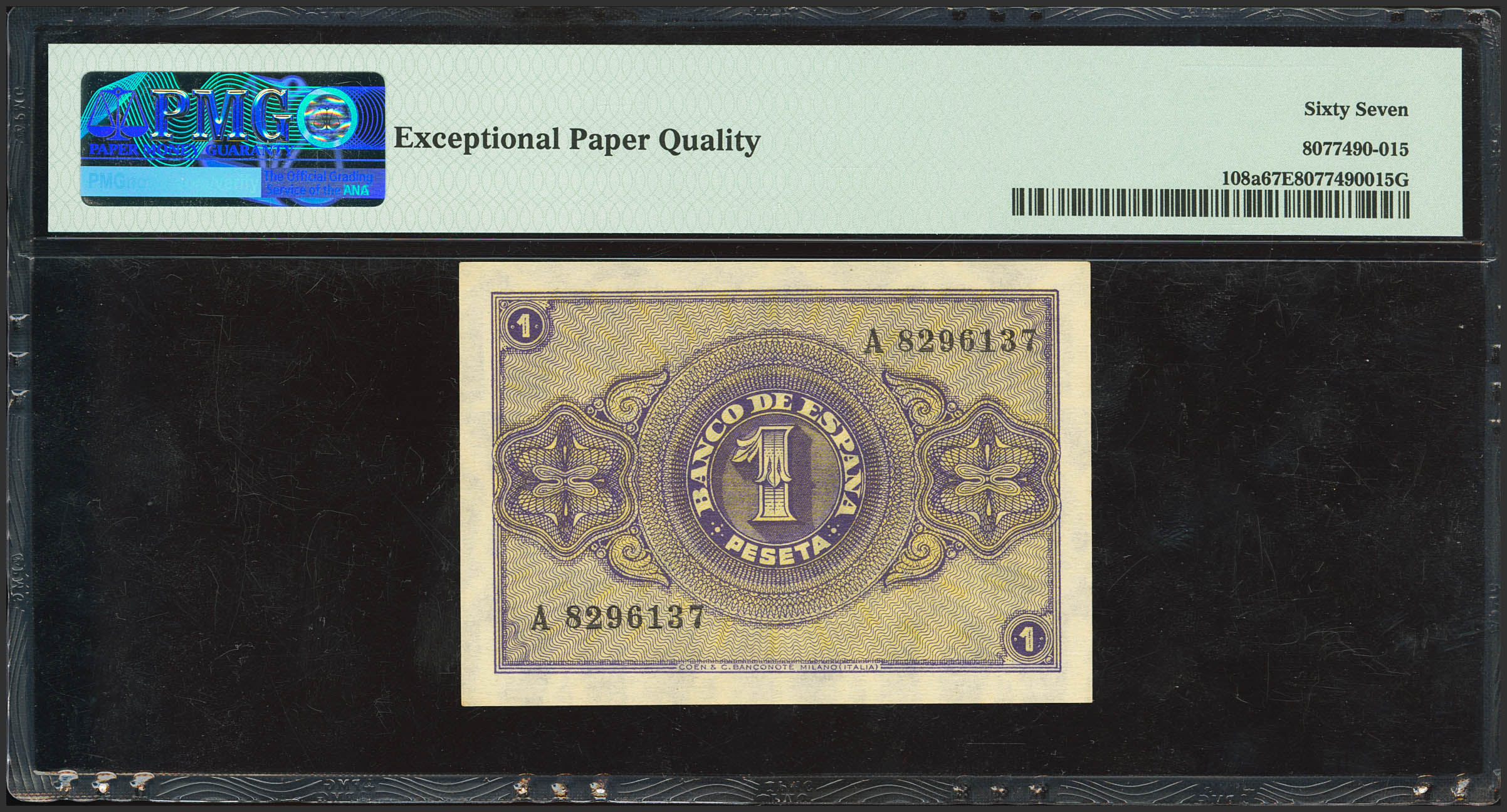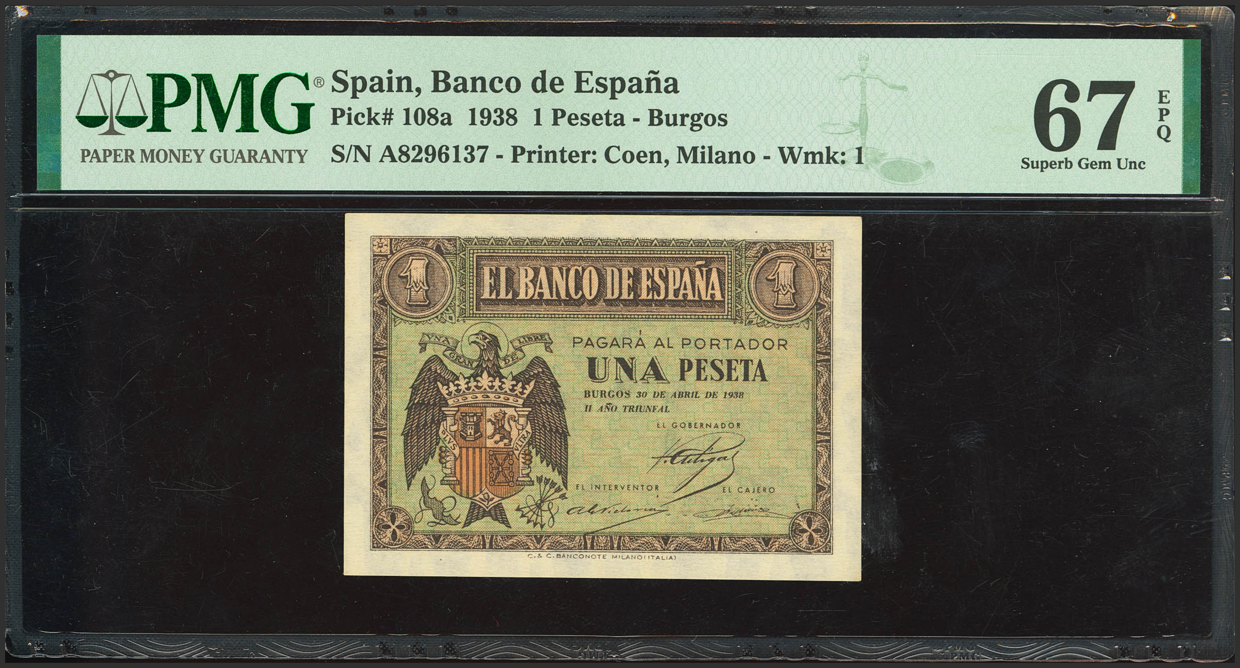 1 Peseta. 30 de Abril de 1938. Serie A. (Edifil 2023: 428, Pick: 108a). Apresto original. SC. Encapsulado PMG67EPQ.