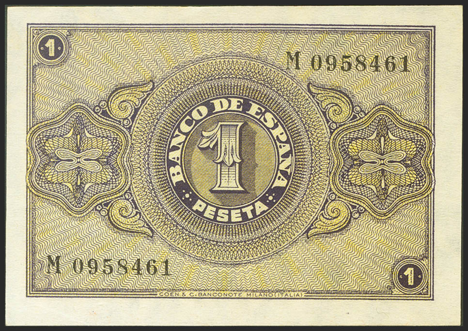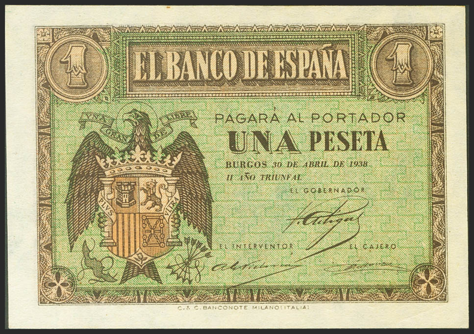 1 Peseta. 30 de Abril de 1938. Serie M. (Edifil 2021: 428a). Apresto original. SC.
