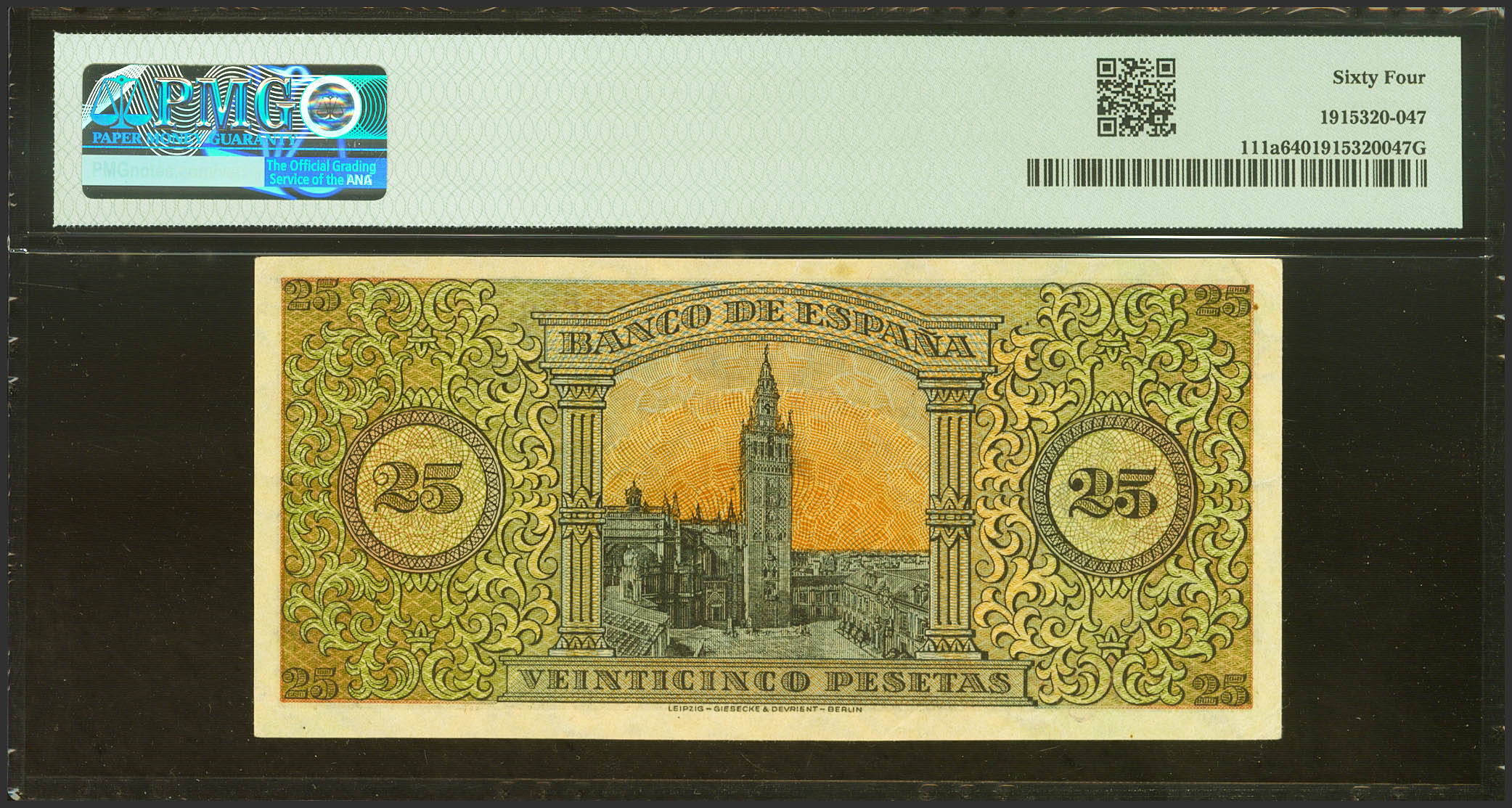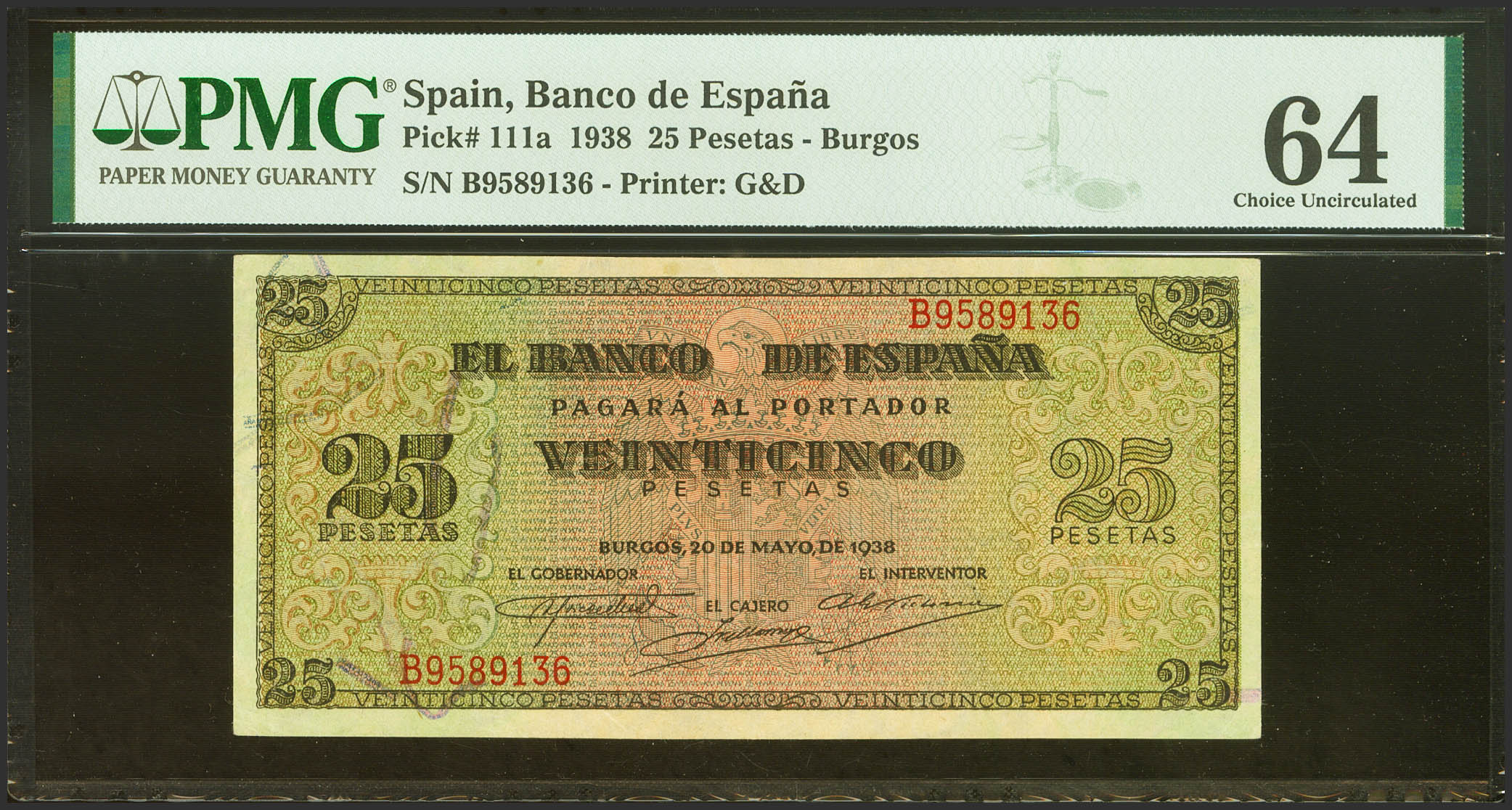 25 Pesetas. 20 de Mayo de 1938. Serie B. (Edifil 2023: 430a, Pick: 111a). Inusual en esta calidad. SC. Encapsulado PMG64.