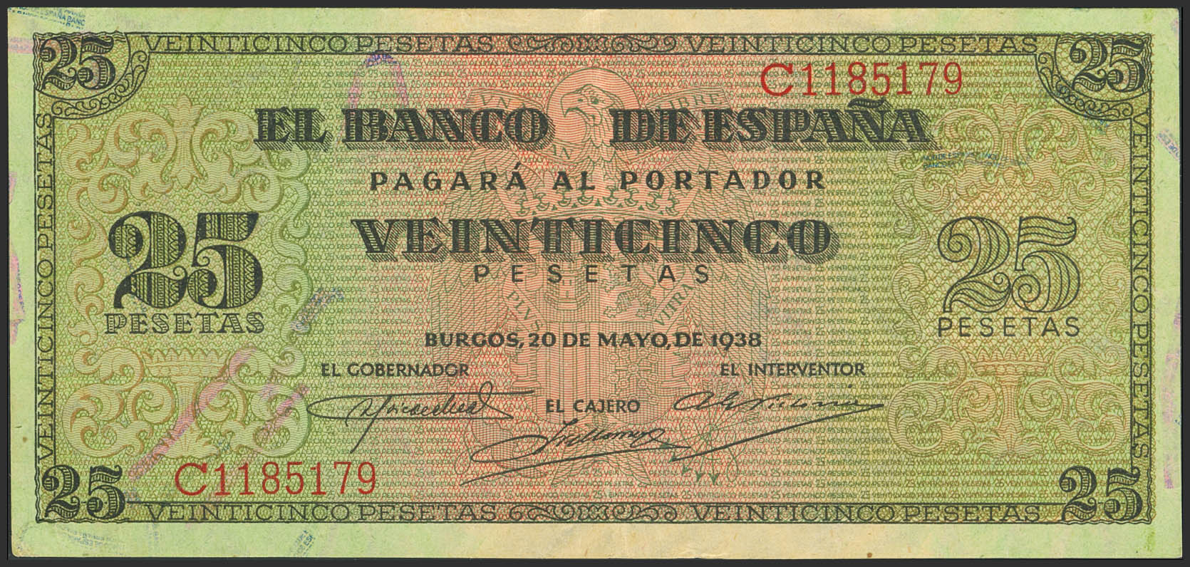 25 Pesetas. 20 de Mayo de 1938. Serie C. (Edifil 2023: 430a). Conserva parte del apresto original. EBC.